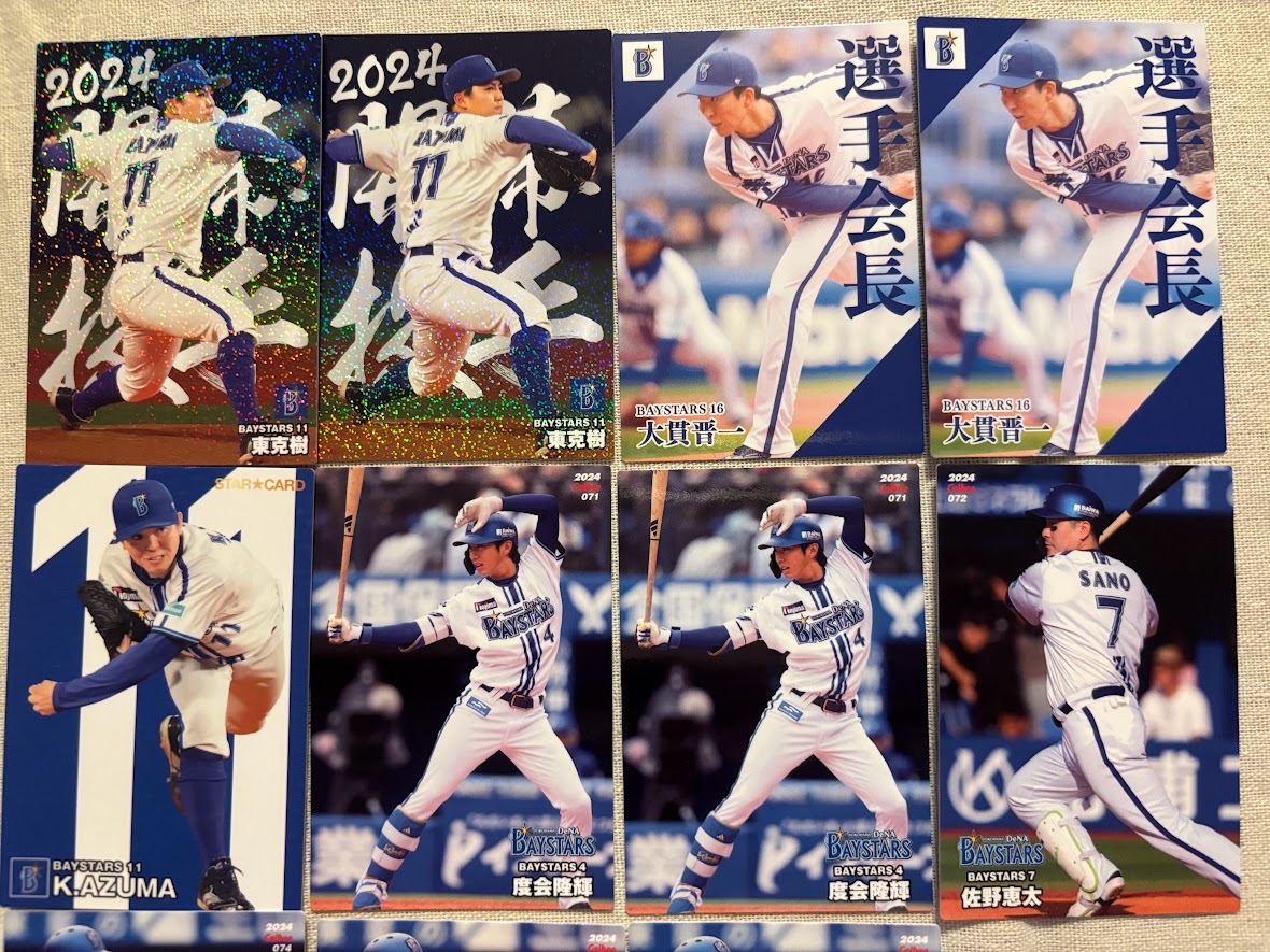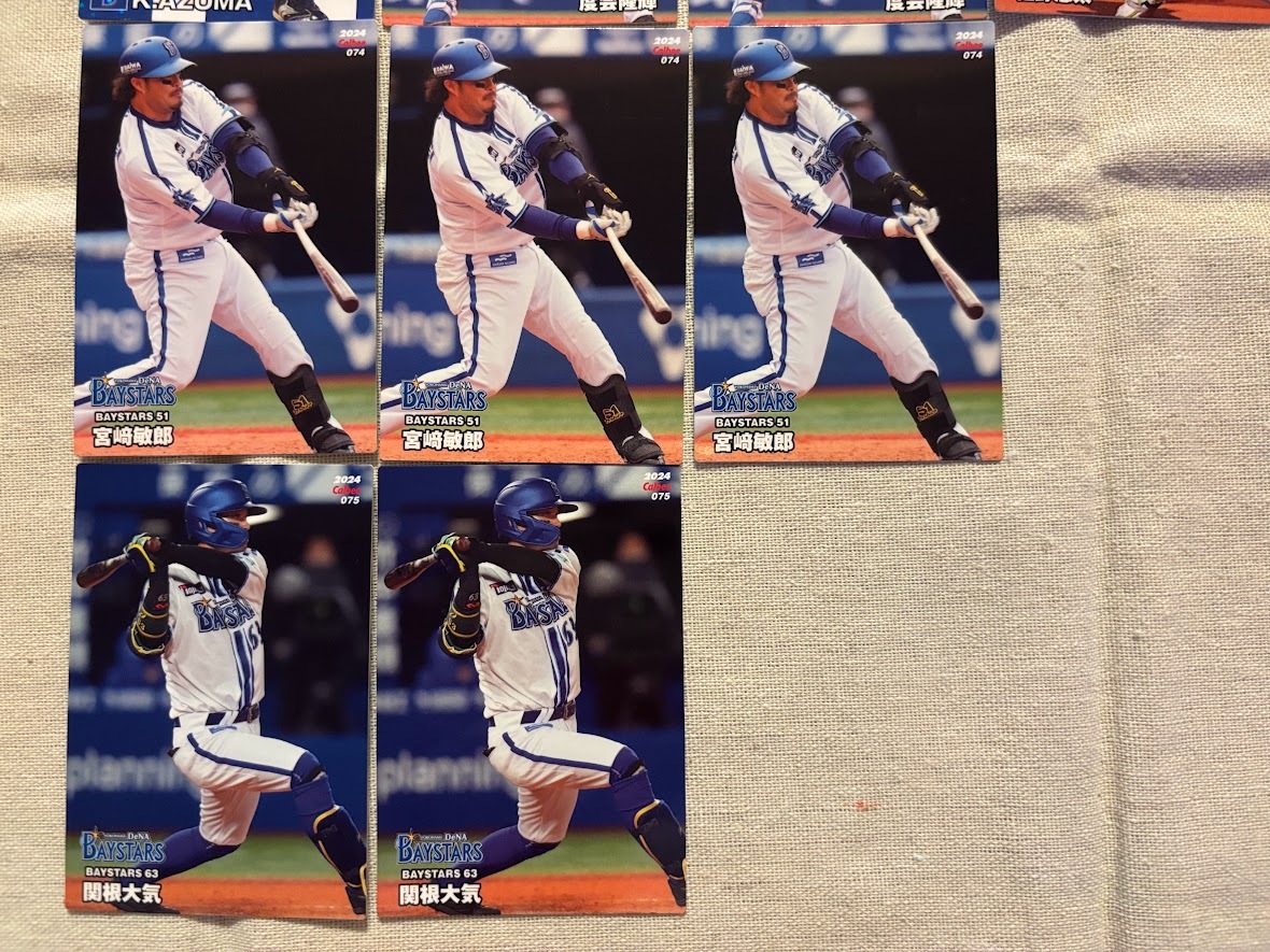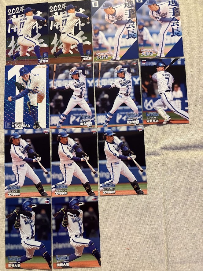 カルビー プロ野球チップス2024 第2弾 横浜DeNAベイスターズ ■開幕投手カード 東克樹×2枚 ■選手会長カード 大貫晋一×2枚 ■スターカード 東克樹 ■レギュラーカード 佐野恵太 度会隆輝×2枚 宮崎敏郎×3枚 関根大気×2枚 以上の計13枚セットです。 開封後、この13枚をまとめて袋に入れて保管しておりました。 神経質な方はご遠慮ください。 | ||||||||
