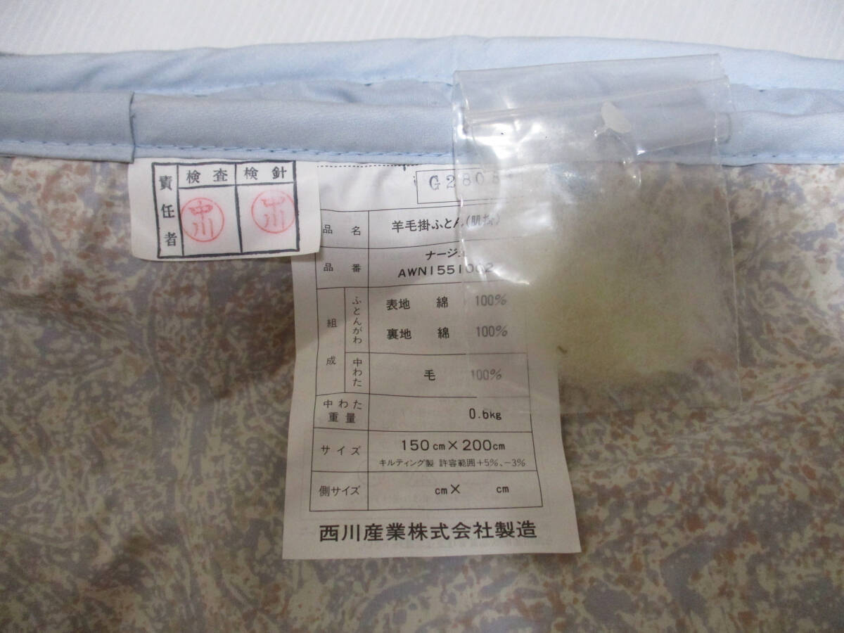 未使用☆セリーヌ CELINE 羊毛掛布団 肌掛 馬車刺繍 150cm×200cm 西川産業 です。素材は表、裏地 綿100、中綿 毛 100です。色は薄いブルー系です。色は画像でご判断ください。