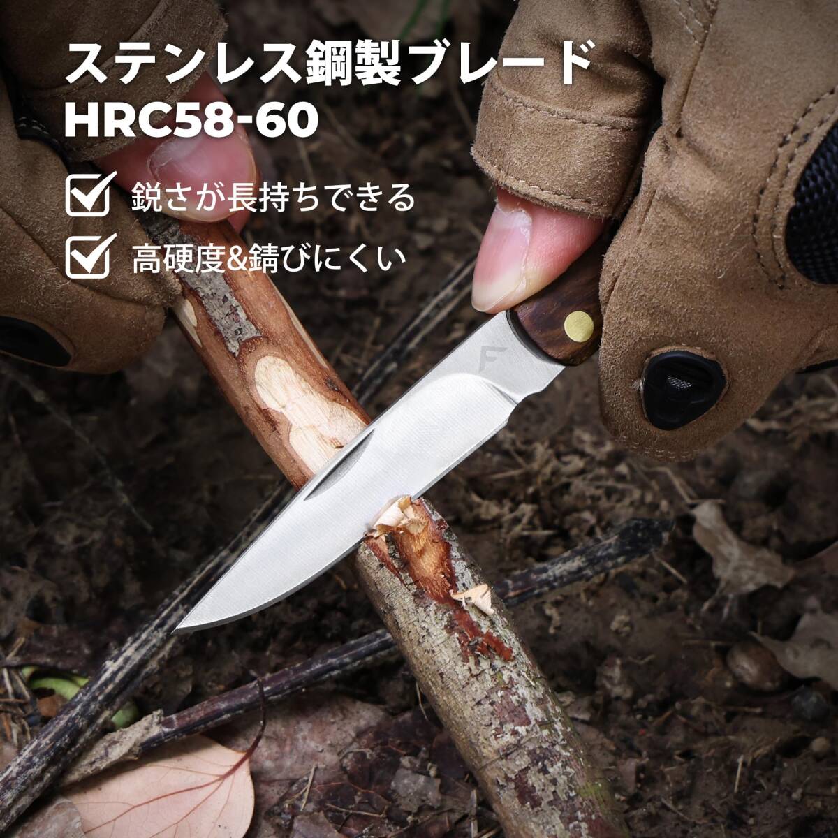 【仕様】全長:約163mm、刃長:約70mm、本体重量:約62g、刃厚さ:約2mm、ハンドル素材:ブビンガ、ブレード材質:ステンレス鋼。切れ味抜群で硬度もHRC60までに達します。優れた耐食性および耐摩耗性を持っています。