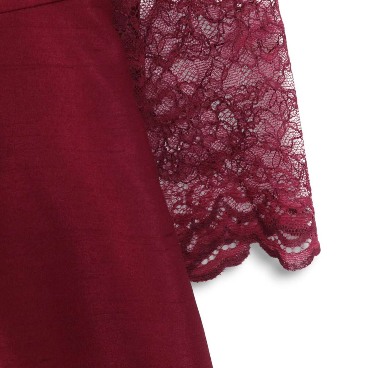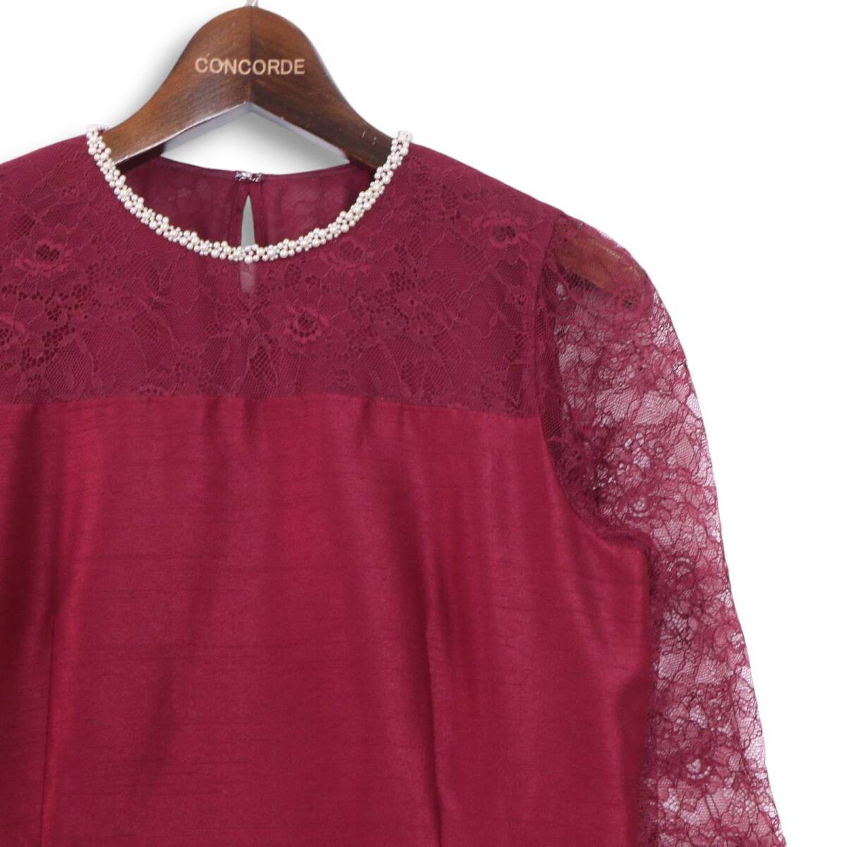 デコルテと袖に繊細なレースをあしらったワンピース。袖があるパーティドレスだから、上着や羽織が必要なく、1枚で着られるのがうれしい!華やぎがあり、パーティなどでも存在感を示してくれます。