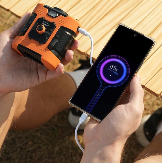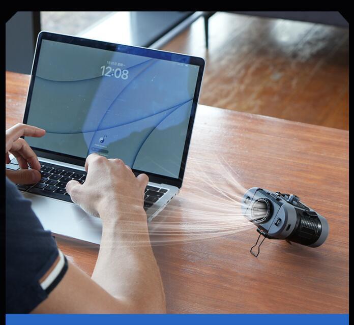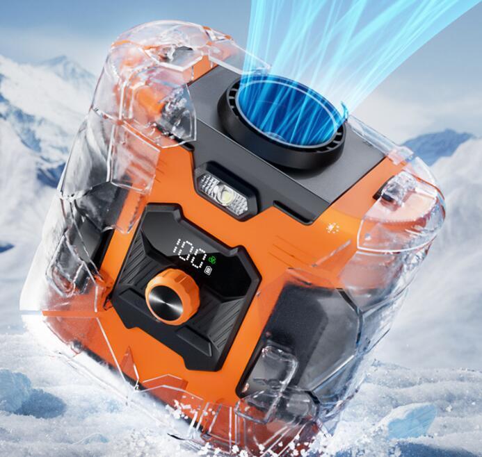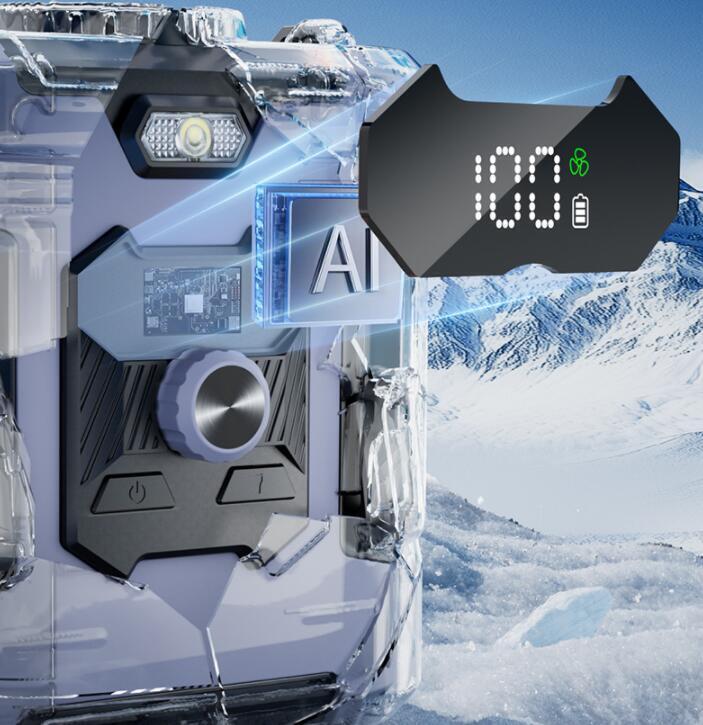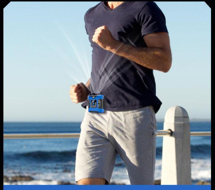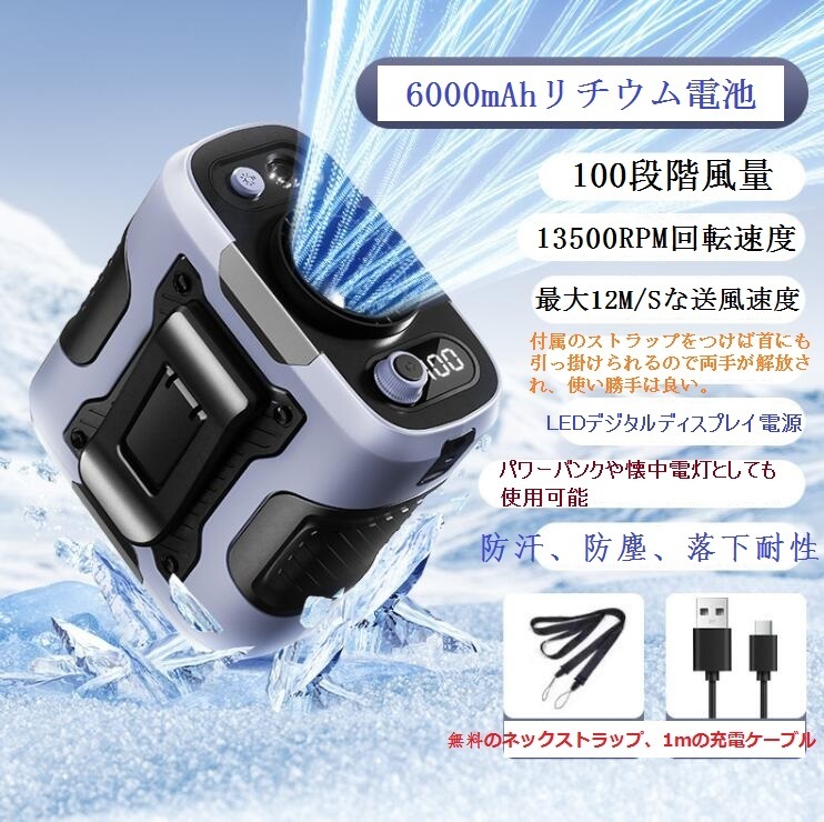 風力は通常の扇風機の10倍に達します。最大12M/Sな送風速度、13500RPM回転速度で3秒ほど360°全身が冷たい風に包まれます。内蔵の6000mAhリチウム電池、弱モードでは約24時間使用可能です。