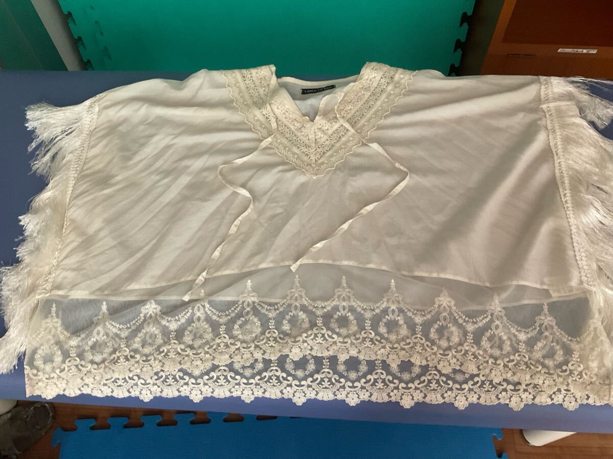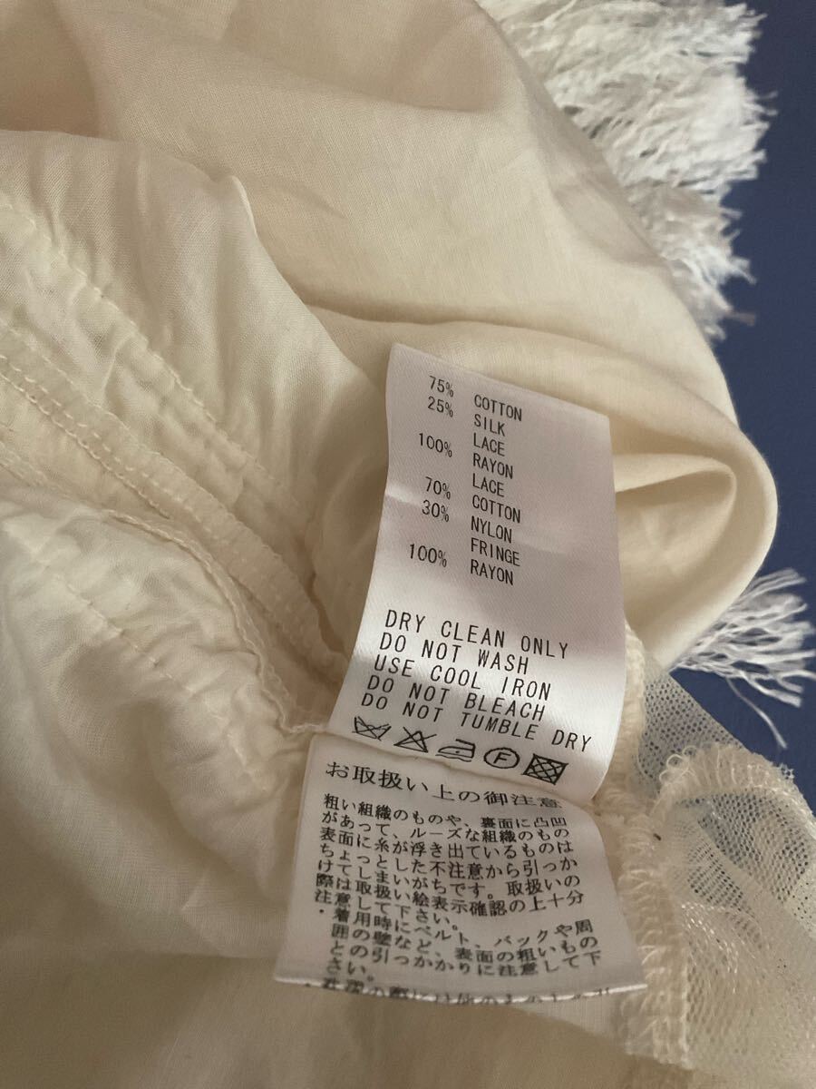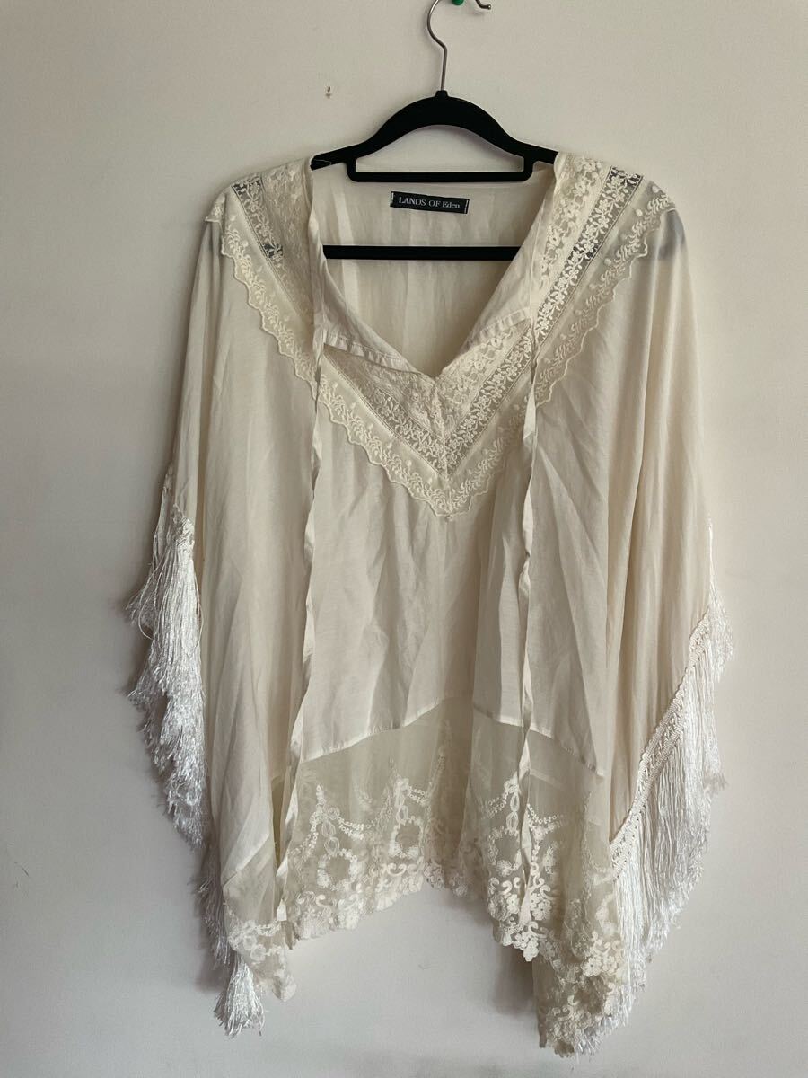 長いフリンジと繊細なレース装飾が特徴で、夏にぴったりの軽やかで風通しの良い素材を使用。