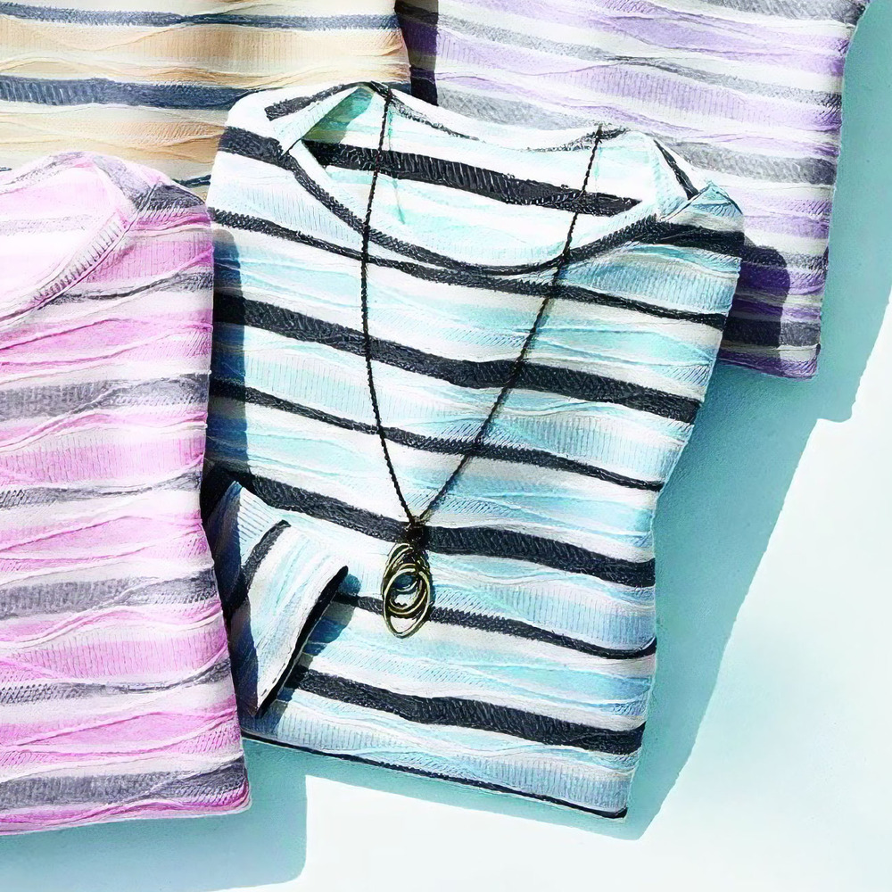 ・特殊な紡績方法で彩りの良い杢調表現が特徴の「リバーエース」を使用して、色の重なりがきれいな表情豊かなタックジャカード