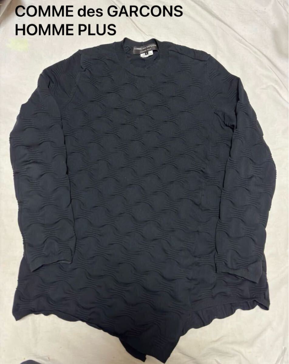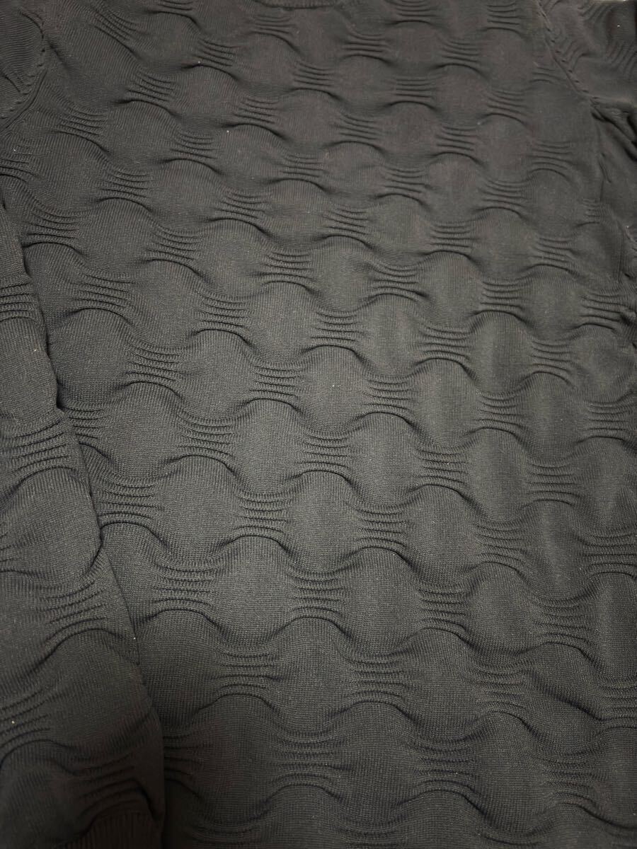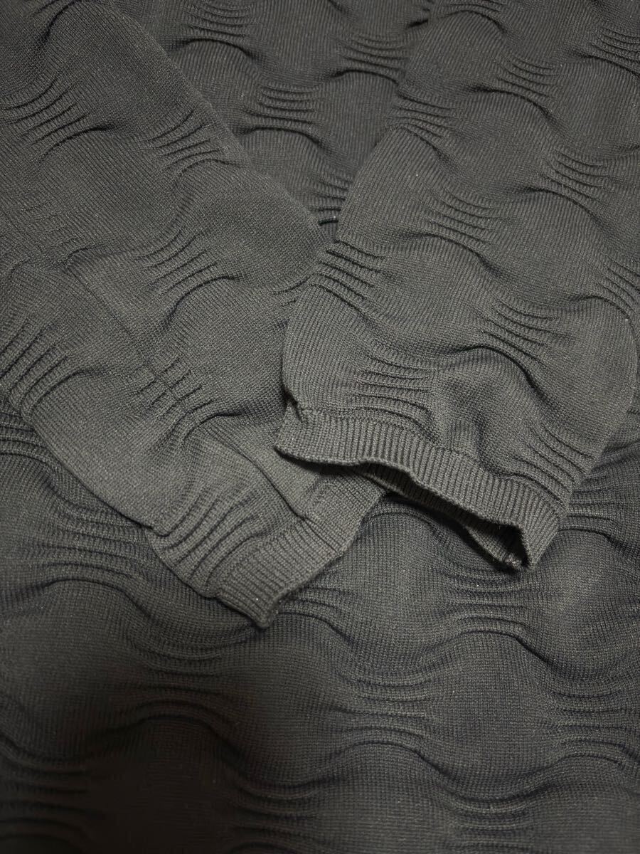 凹凸感を出す加工を施し歪みや独特の風合いに仕上たニットになりますが、スウェットのような素材感です。ブラックはあまり出てこないので、ぜひお早めにご検討ください。