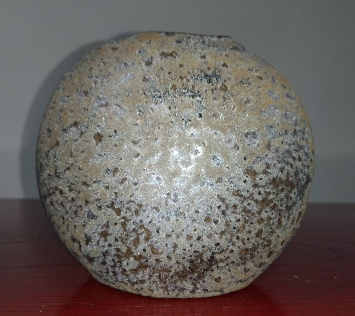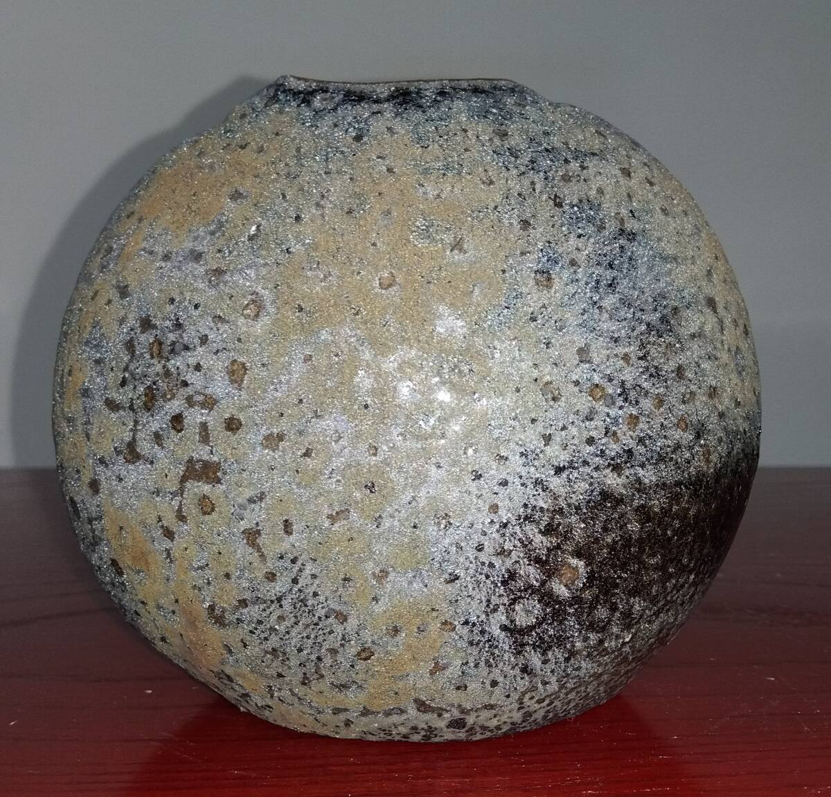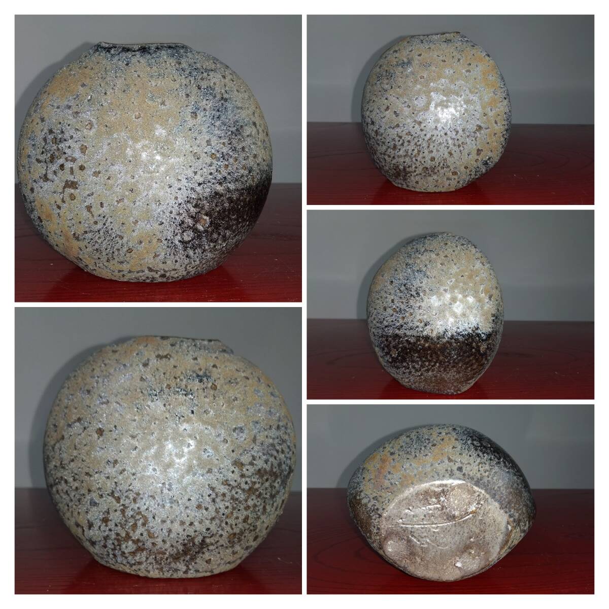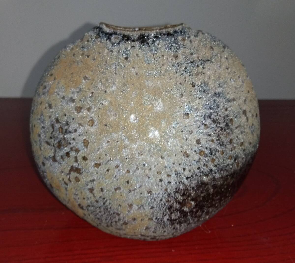 灰釉に呈色剤として鉄化合物を加えた「高火度釉」鉄砂釉(てっしゃゆう)は 所々やや赤みを帯びた表面と共に見事な黒い結晶を 布地網目紋様全体に浮きだたせえも言えぬ風趣を醸し出しています。 いけられる一輪の花をより一層鮮やかな色彩そして繊細孤高の美しさへと心和み癒してくれるでしょう。 師の卓越した力強いヘラ使い面取りわざが見事な造形美へ昇華された逸品です。日常生活雑器とは言え師の斬新なデザイン造形観審美眼が垣間見られる逸品をご堪能下さい. サイズ:口径40/55mm全高120mm厚み幅85mm全幅125mm包装:クラフトボックスプチプチ包装