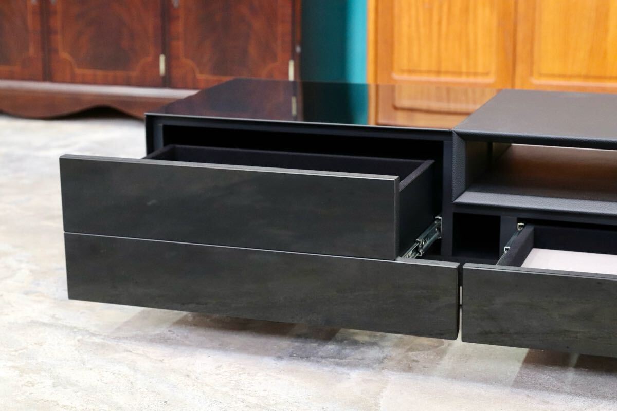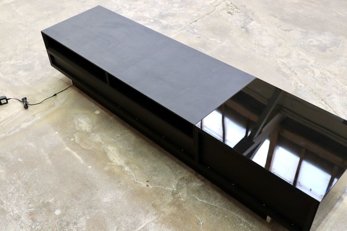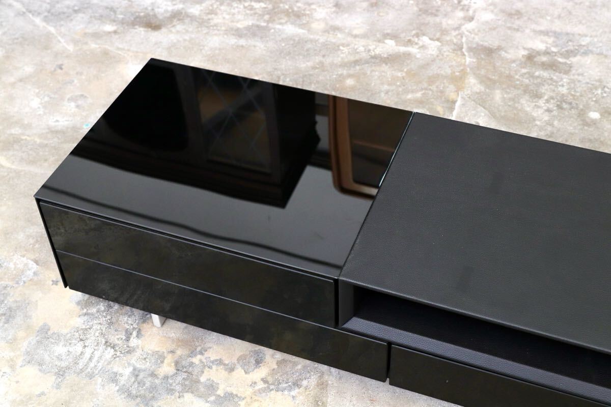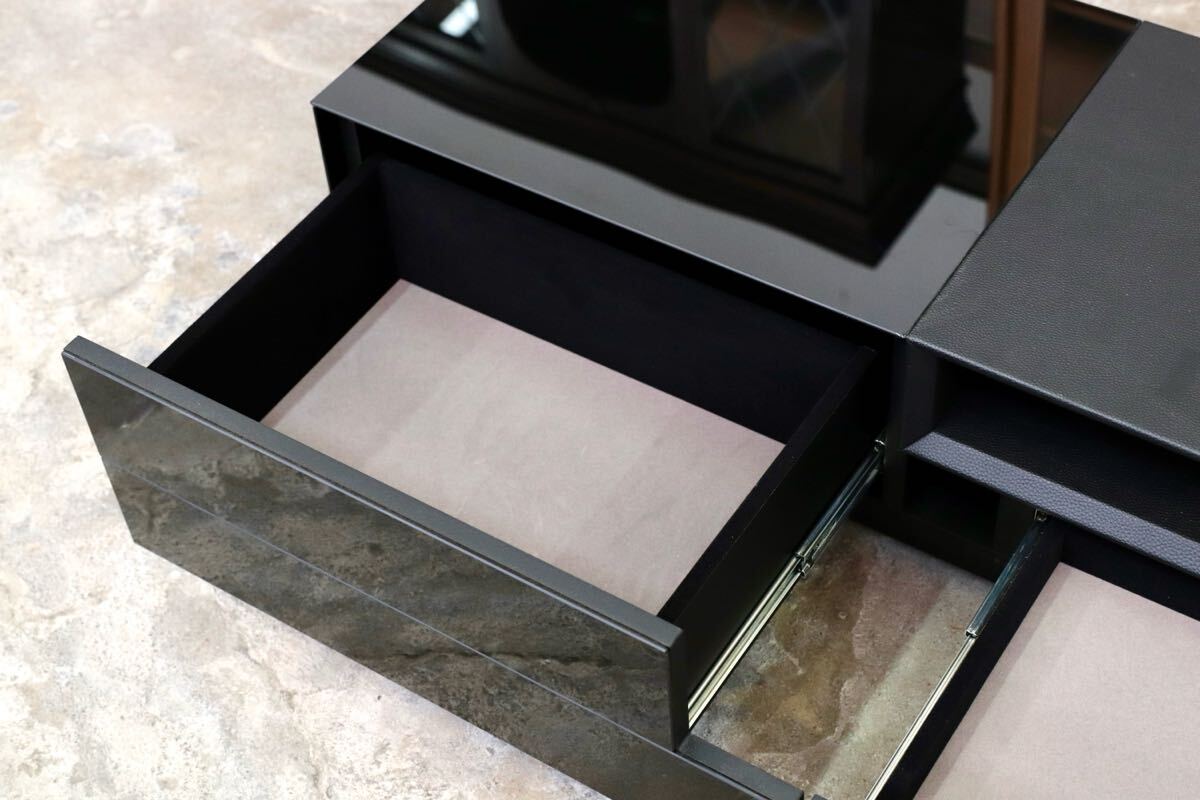 レザー張りと鏡面仕様の組み合わせがモダンな印象を与えます。