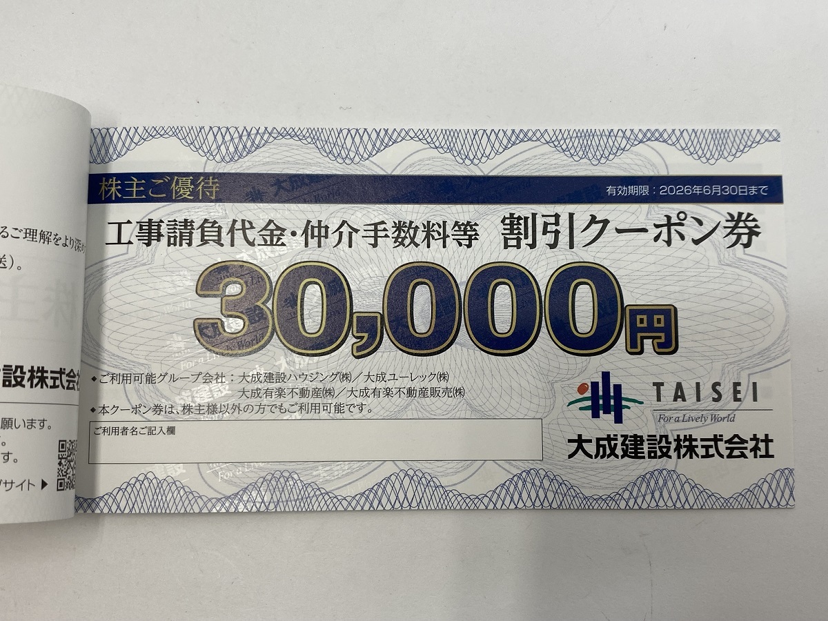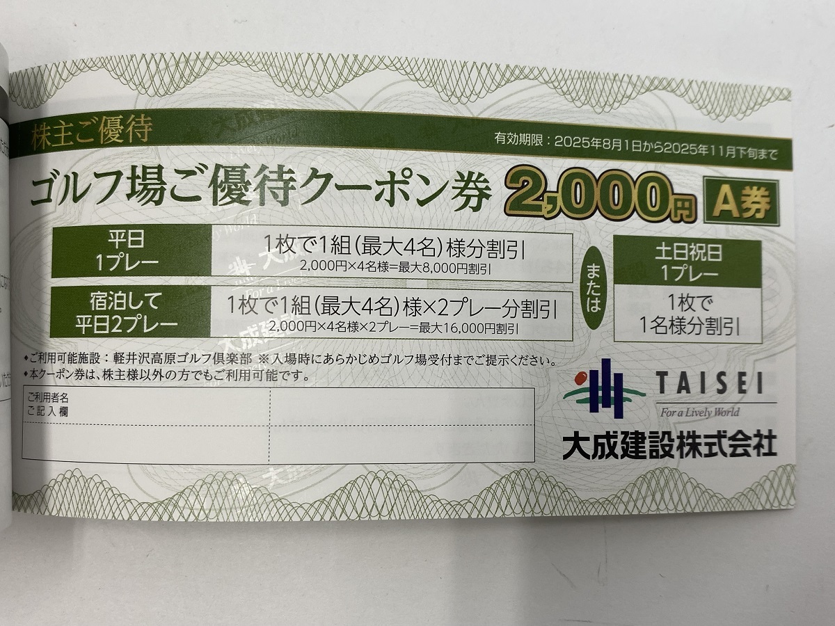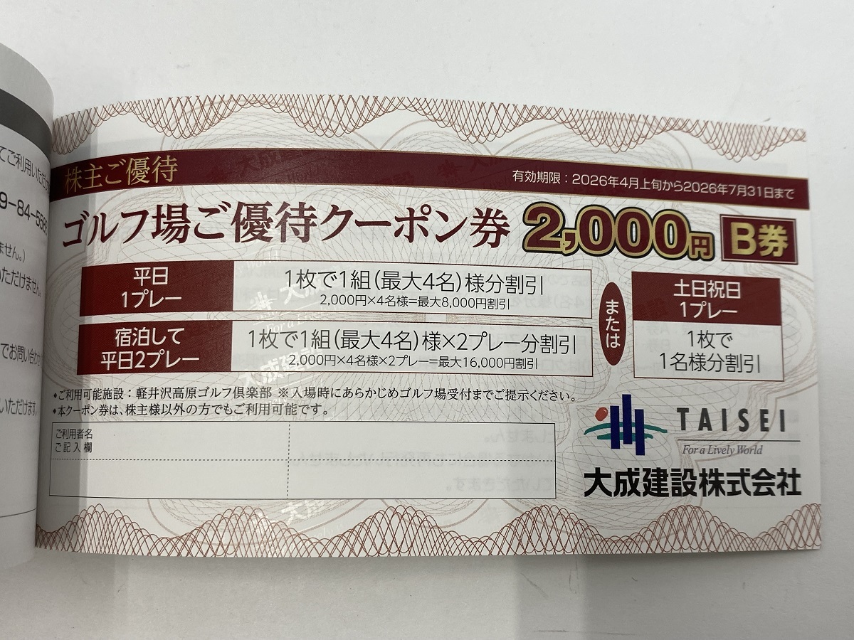 | 商品説明 | 【商品】 大成建設 株主優待券 工事請負代金・仲介手数料 30000円券×3枚 ゴルフ場優待クーポン券 2000円券 A券 B券 1冊 【有効期限】 工事請負代金・仲介手数料クーポン券:2026年6月30日迄 ゴルフ場優待クーポンA券:2025年8月1日~2025年11月下旬迄 ゴルフ場優待クーポンB券:2026年4月上旬~2026年7月31日迄 |