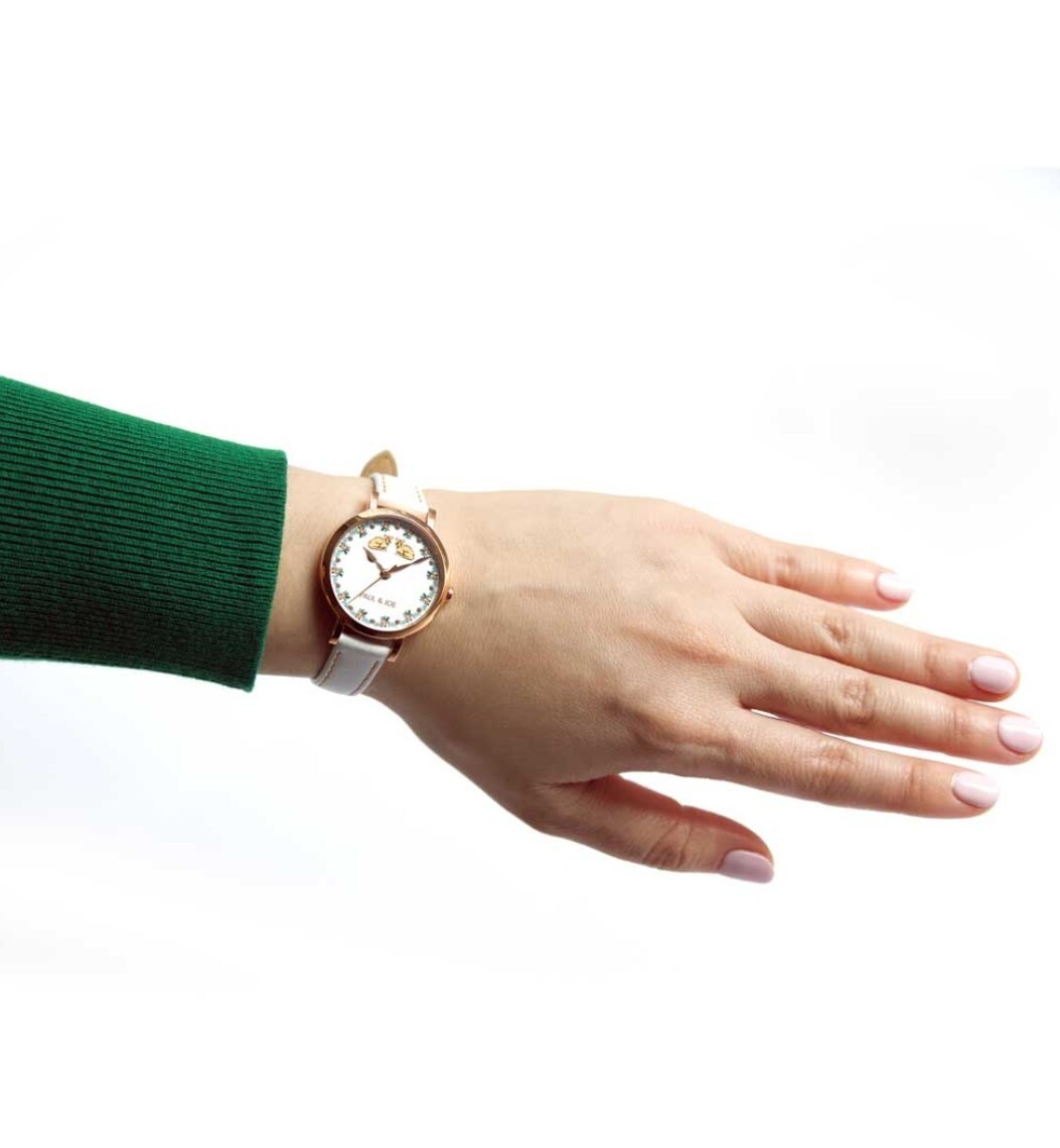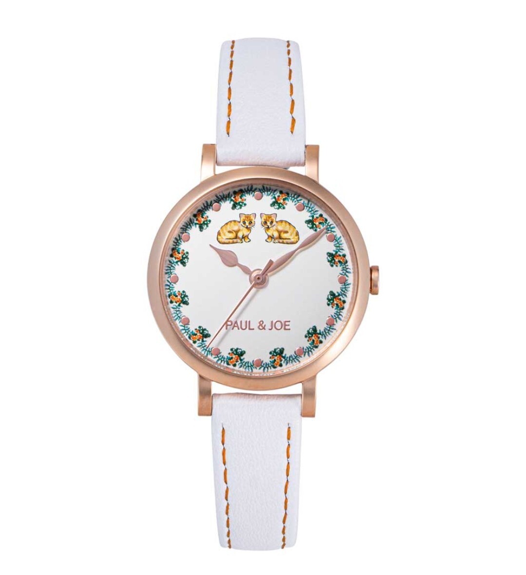 柔らかな光沢をもつパーリーホワイトのダイアルには、蔓ばらに囲まれた2匹の愛らしい猫をデザインし、繊細で自然なタッチとカラーが美しい、絵本の1ページのような仕上がりに。