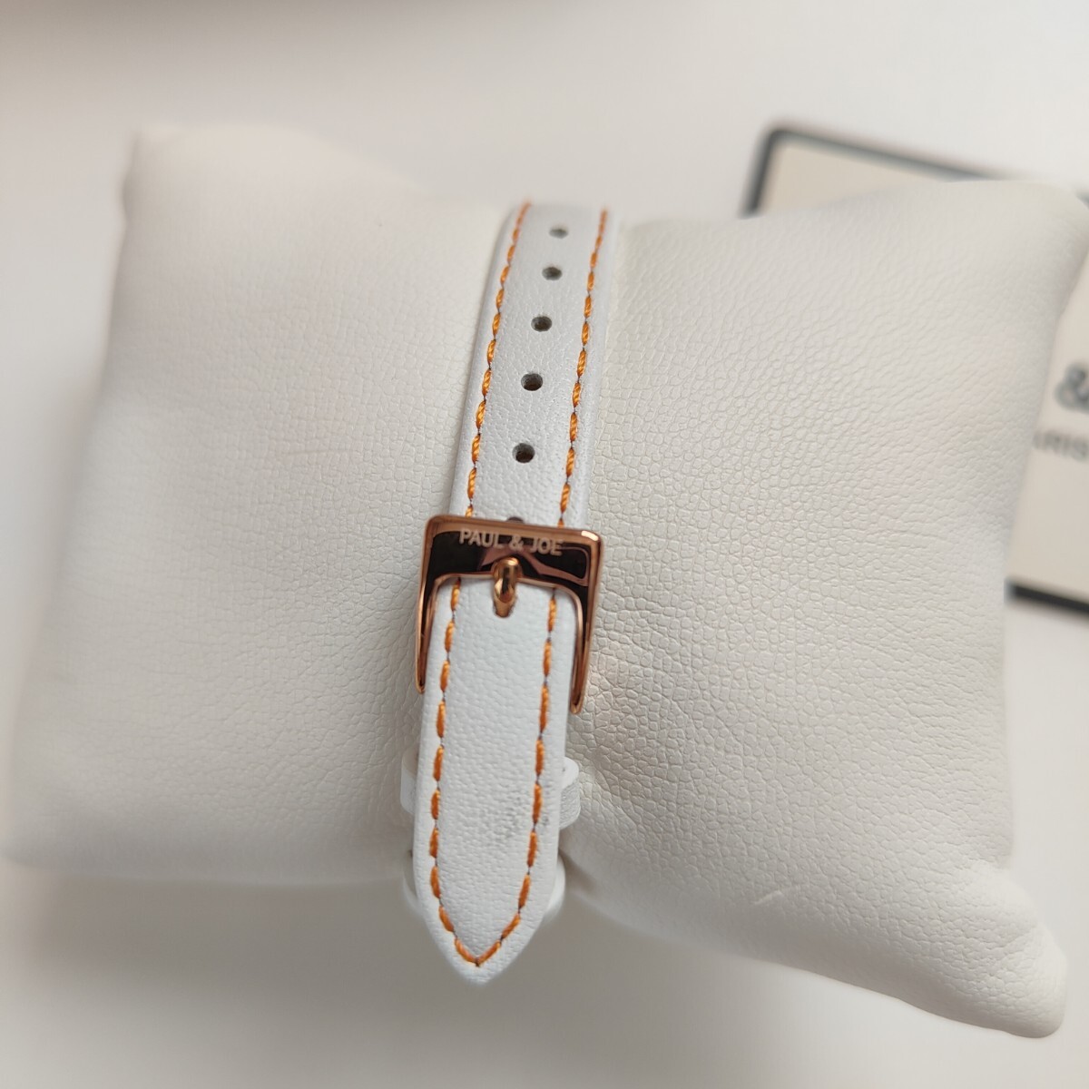 ピンクゴールドモデルは、ホワイトカーフレザーストラップにオレンジブラウンのステッチを配した爽やかでフレッシュなカラーリングに。