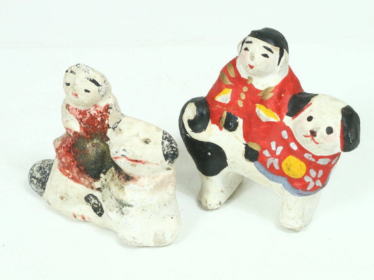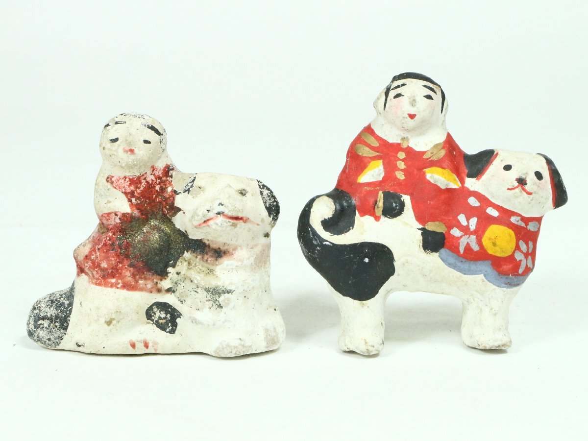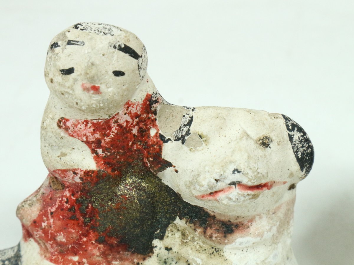 品名】 古い土人形 犬乗り童子 2点 郷土玩具 民芸 伝統工芸 風俗人形 置物 【状態】 経年によるキズやヨゴレ、イタミ、剥落がございます。 時代や産地、作者の記載がある商品に関しては当店での判断によるものですので、保証はいたしかねます。あくまで参考程度とお考えいただ き、画像による判断をお願い致します。 上記を含む商品の状態や詳細(材質等)を写真にてご確認いただき、納得された上での入札をお待ちしております。 【大きさ】 大きい方 幅:約7.5cm 奥行:約3.5cm 高さ:約7.5cm (採寸につきましては多少の誤差があるかと思いますので、予めご了承ください。) |