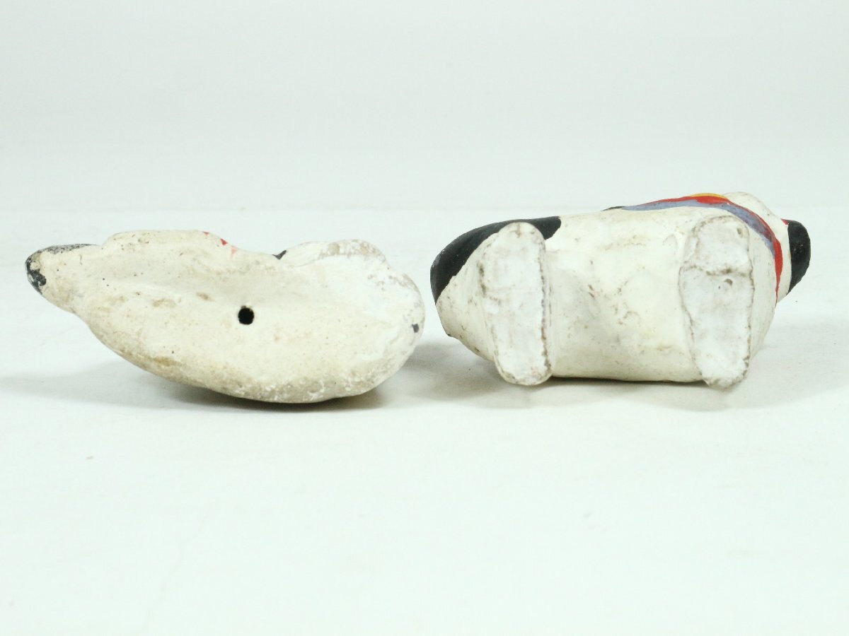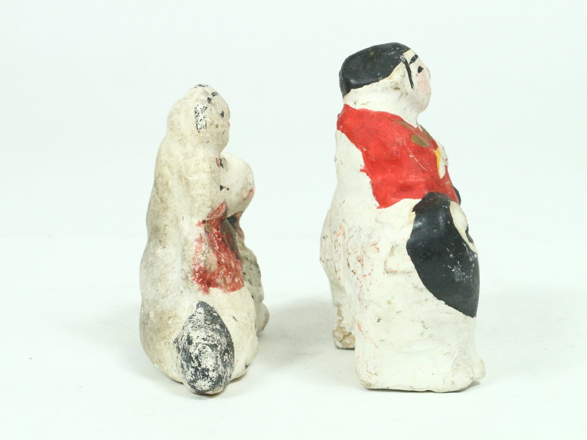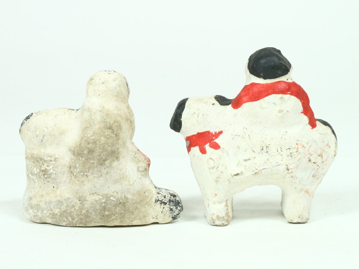品名】 古い土人形 犬乗り童子 2点 郷土玩具 民芸 伝統工芸 風俗人形 置物 【状態】 経年によるキズやヨゴレ、イタミ、剥落がございます。 時代や産地、作者の記載がある商品に関しては当店での判断によるものですので、保証はいたしかねます。あくまで参考程度とお考えいただ き、画像による判断をお願い致します。 上記を含む商品の状態や詳細(材質等)を写真にてご確認いただき、納得された上での入札をお待ちしております。 【大きさ】 大きい方 幅:約7.5cm 奥行:約3.5cm 高さ:約7.5cm (採寸につきましては多少の誤差があるかと思いますので、予めご了承ください。) |