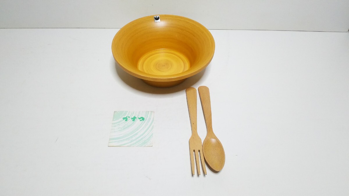 口径が27cmの大ぶりなサイズでブナ材の木目と巻目の美しさを楽しめます。画像にある木製サーブをお付けします。