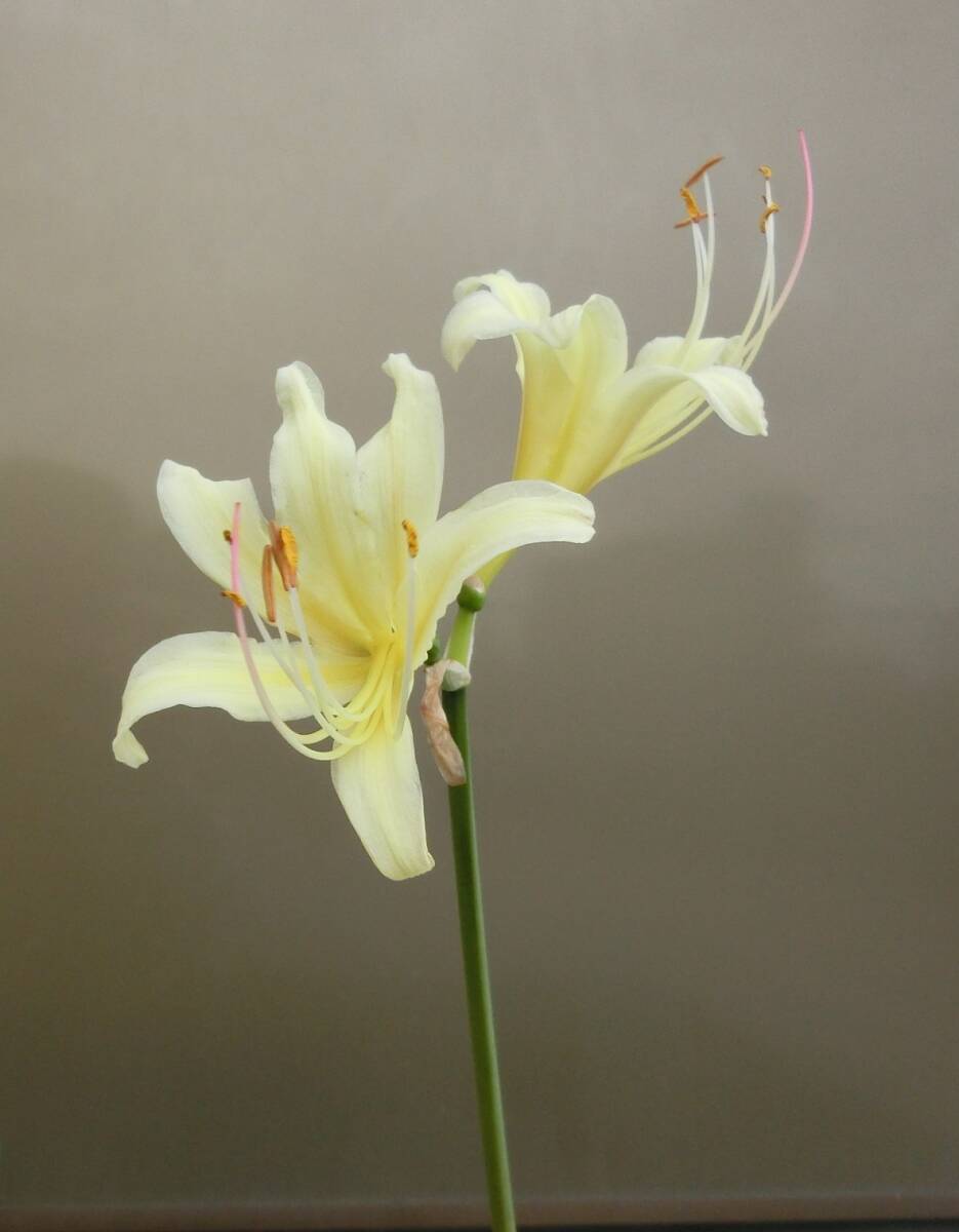 リコリスの園芸品種で、名称は入手時のものです。20年ほど前に譲り受けた球根の増殖品です。晩夏から初秋に淡黄色の花を咲かせる小型種で、5号ポットで育てると花茎の高さは30㎝になりません。葉は真冬を過ぎると伸びてきて初夏に枯れます。球根はリコリスの園芸品種の中ではやや小さめで増殖は普通です。当方では5号ポット植えとしていますがポット植えでは花立ちはそれほど多くないようで、数球に分球した中から1本咲く程度です。