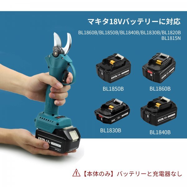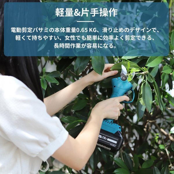この電動剪定バサミの特徴は、パワーが500Wで一般的な剪定道具よりも8~10倍の効率を持ち、長時間の作業をサポートする滑り止めデザインを採用しています。また、SK5合金ブレードにより、耐久性や耐摩耗性に優れ、安定したパフォーマンスを提供します。さらに、マキタの18Vバッテリーにも対応しているため、場所を選ばず使用できるのも大きなメリットです。