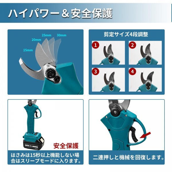 使用時は注意が必要で、初回起動時には30mmの剪定径に設定され、自動スリープ機能が15秒以上無操作の場合に働くため、利便性と安全性が両立しています。この商品は多用途で、家庭用や商業用の剪定作業において大変重宝します。ぜひご検討ください!