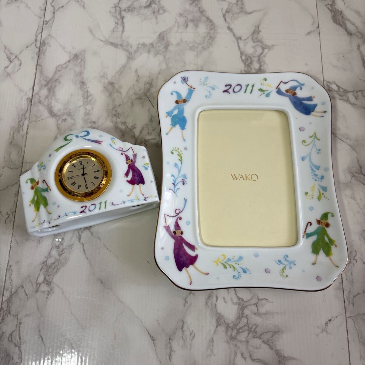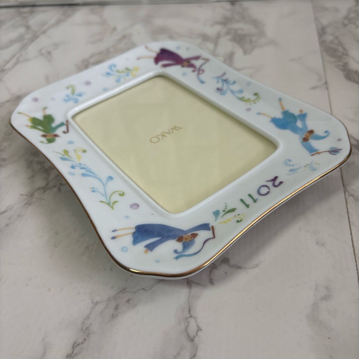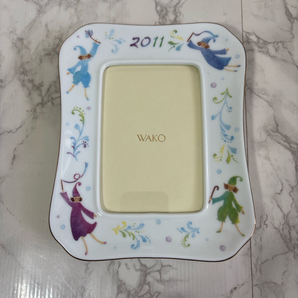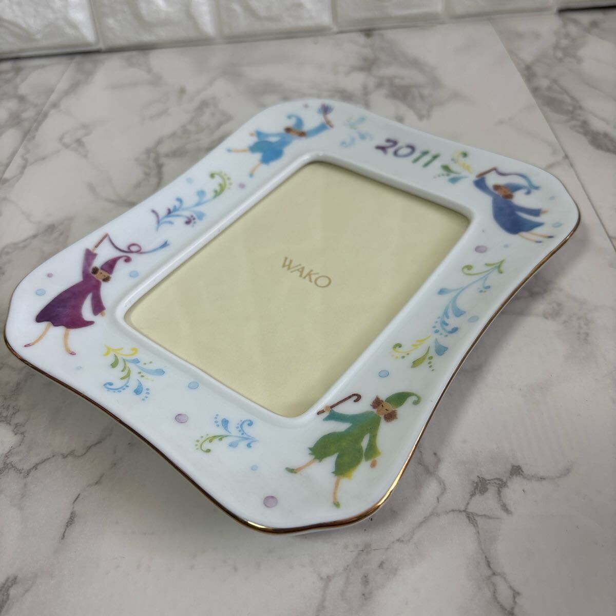 カラフルなイラストが施されたWAKO製の陶器フォトフレーム。