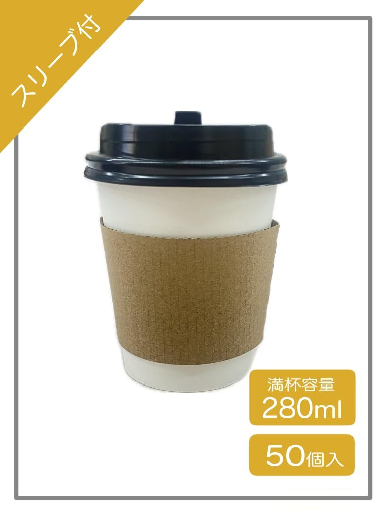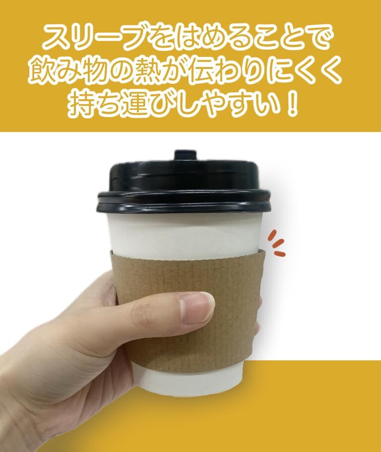 【口紅が目立ちにくい専用黒フタ付】このカップは耐熱加工していません。カフェの定番!厚紙カップ・専用クラフトスリーブ・専用リッド 50個セット。テイクアウトの必需品!専用フタ・スリーブ付でご家庭でもカフェ気分を味わえます。【ご使用上の注意】フタの飲み口をカップの貼り合わせ部分に合わせないでください。中身が漏れることがあります。中身がホットドリンクの場合熱いのでご注意ください。この容器は扱い方によっては漏れる場合がありますので、長時間飲み物を入れたまま車内に放置したり、落としたり、無理な力を加えないでください。まれに製品の中に細長い黒糸状のものが付着している場合がございますが、黒フタを形成する際に発生するもので無害です。ご使用に差し支えありません。