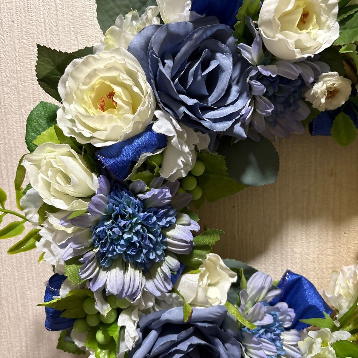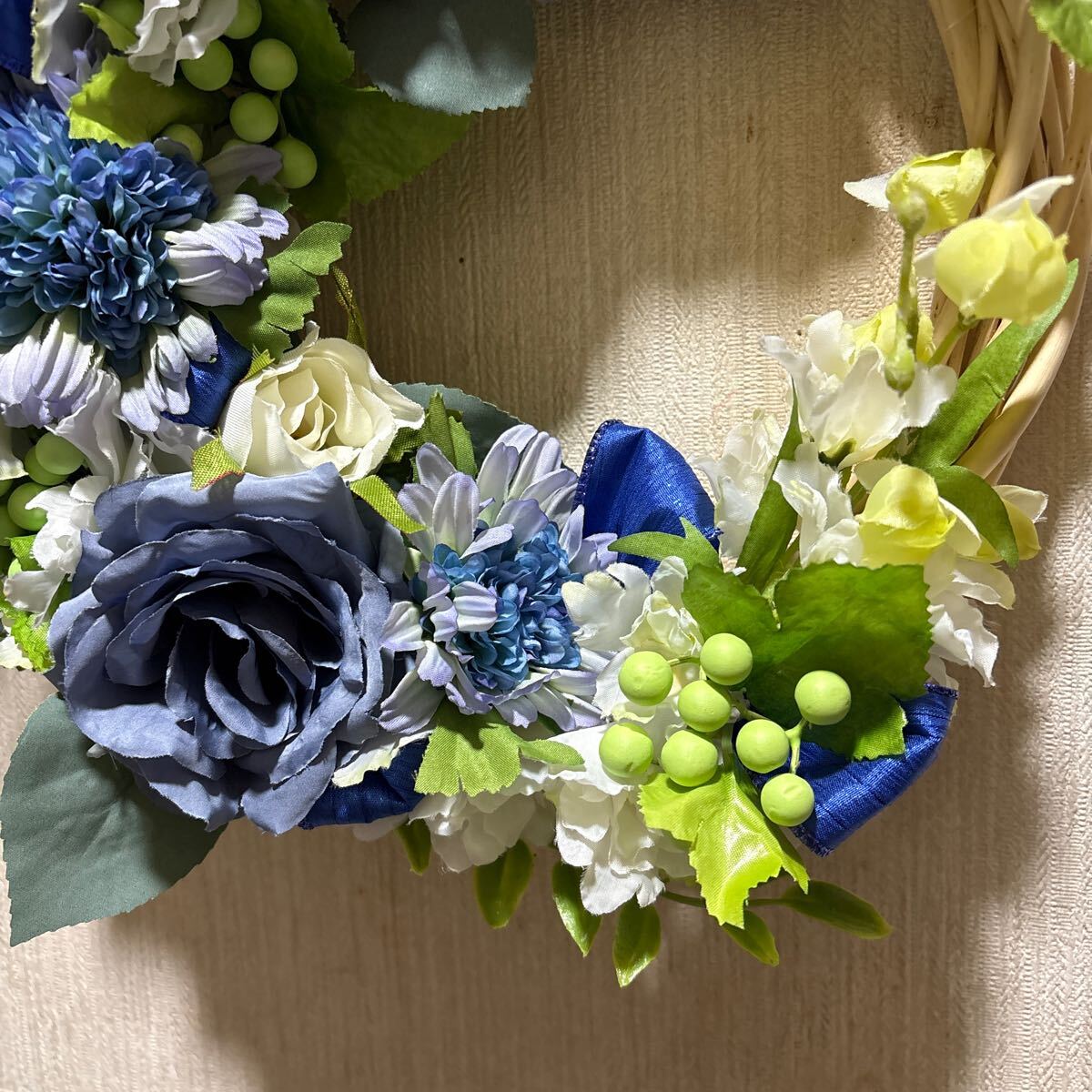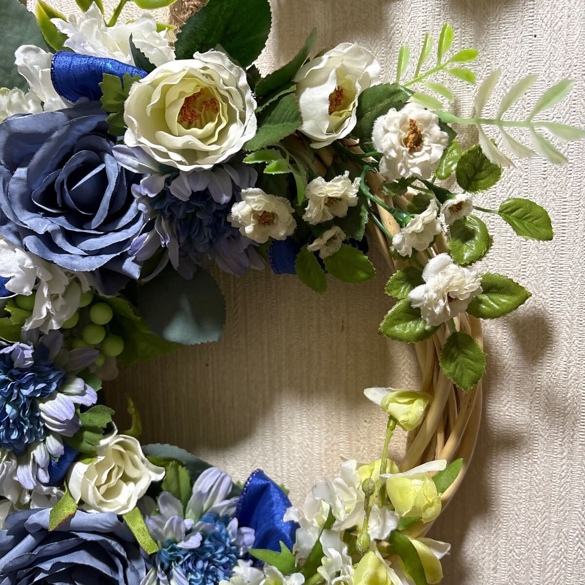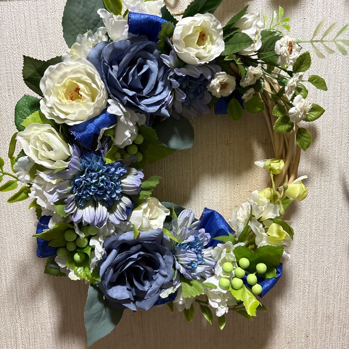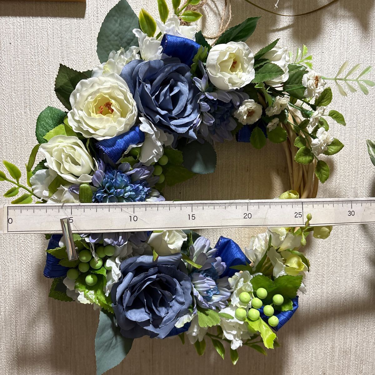 | シックブルー系のバラとダリアに 白いミニバラやランの花などを合わせた 爽やかな色合いのリースです。 布製、プラ製などの造花を使用していますので お気軽に飾っていただけます。 サイズ* 土台は24~25センチの天然素材です。 仕上がりサイズ* 直径約30センチ前後 最後の写真にメジャーと映していますので 参考にしてください。 | ||