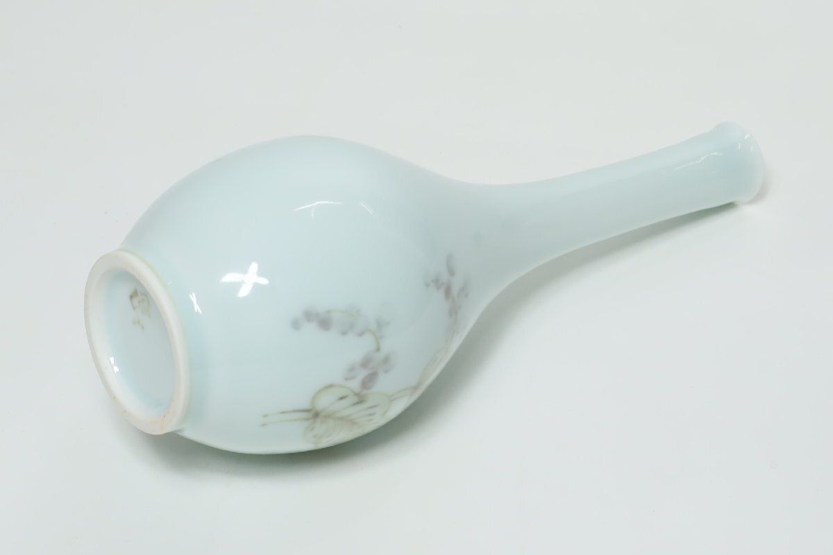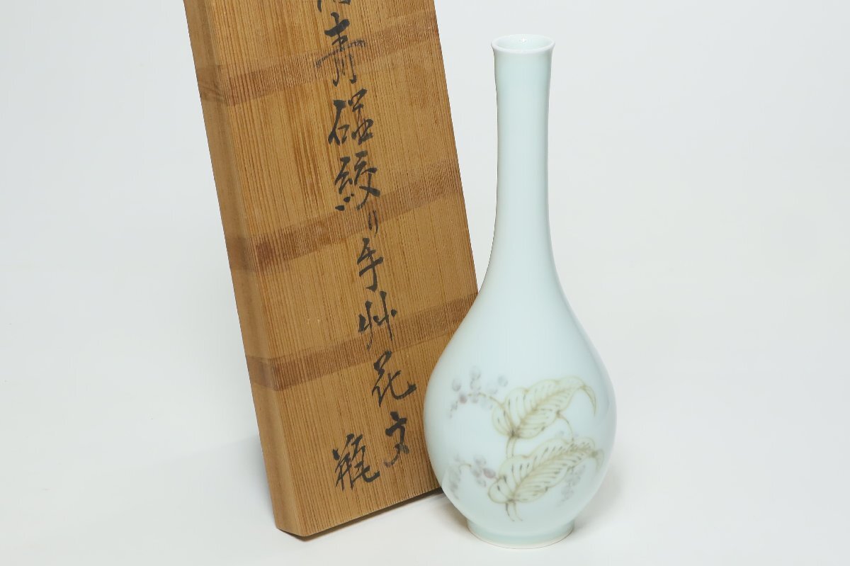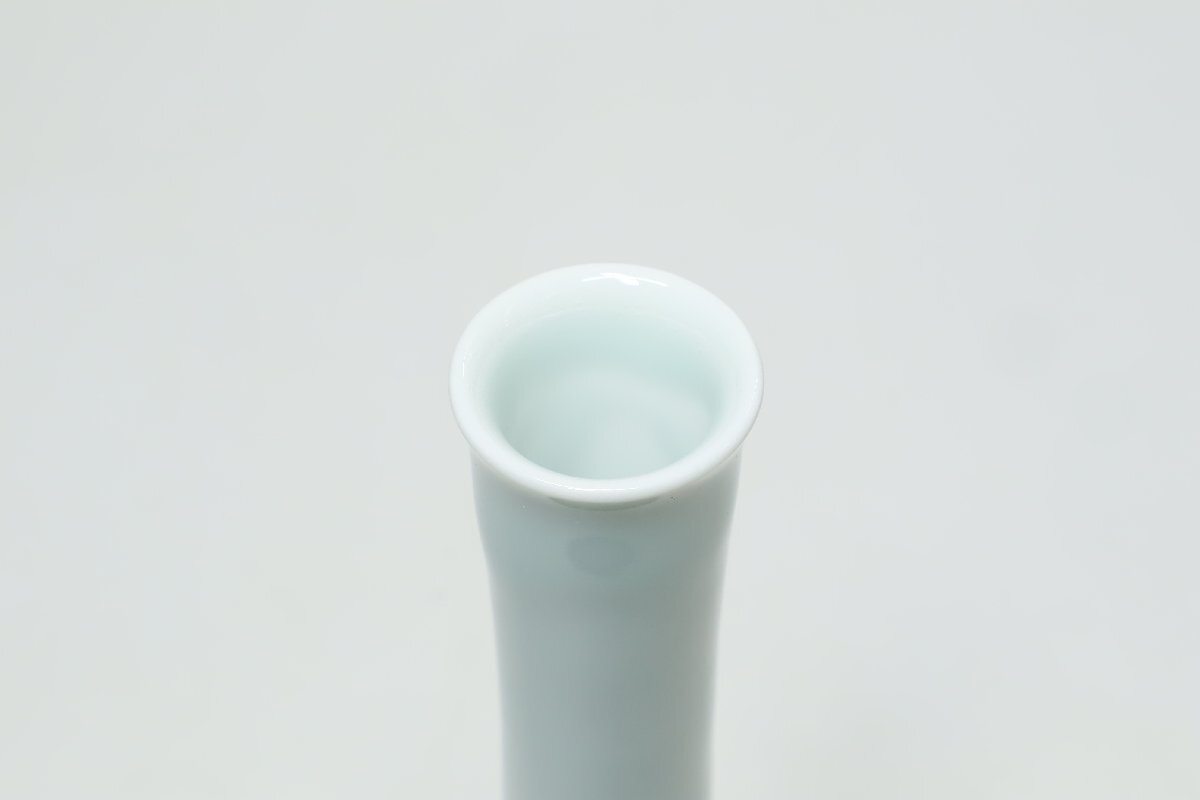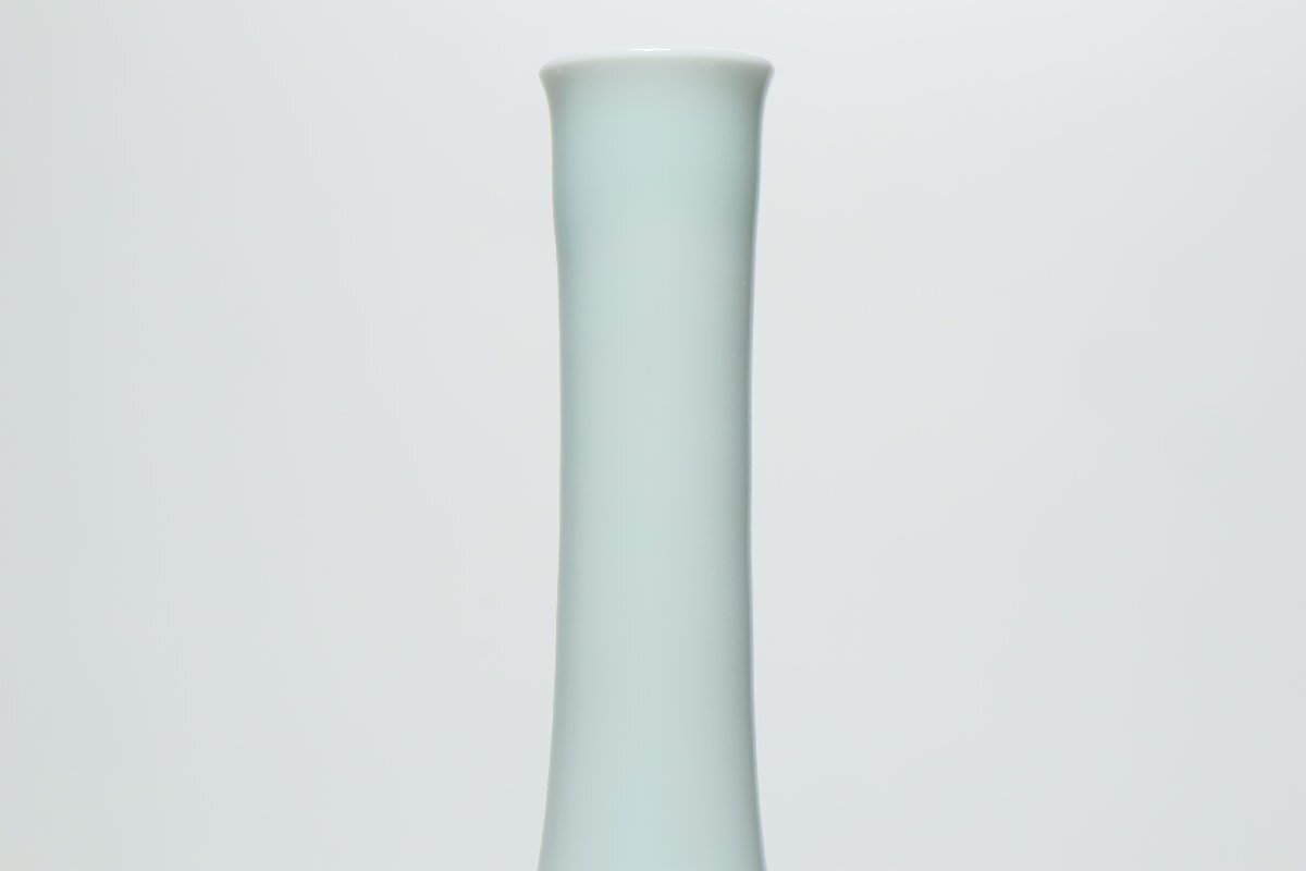 | ・年木庵 松本佩山 薄青磁絞り手花文 瓶 共箱 /有田焼 青瓷 壺 花瓶 花器 鶴首 | ||||||||||