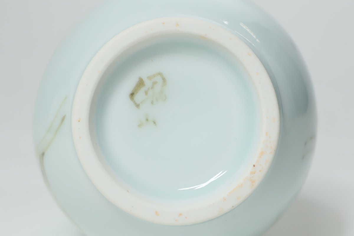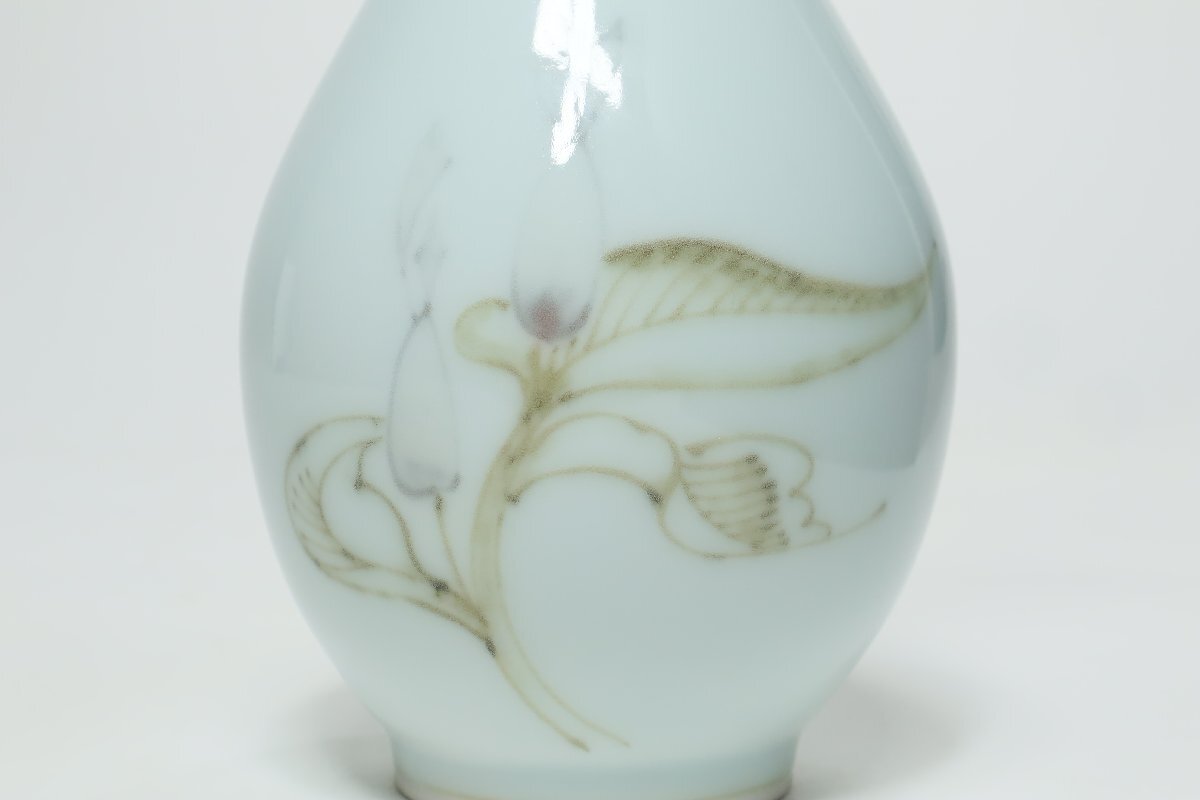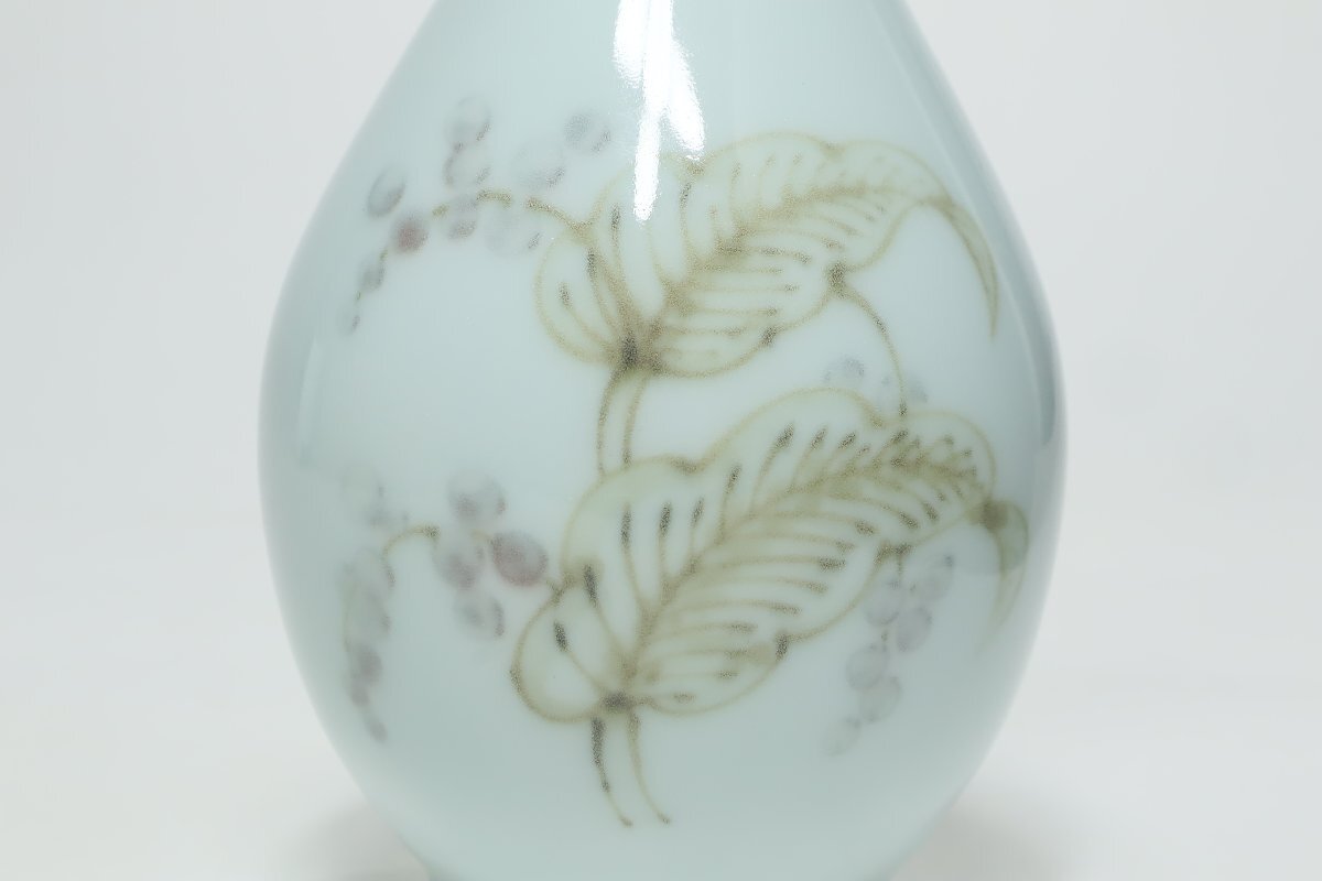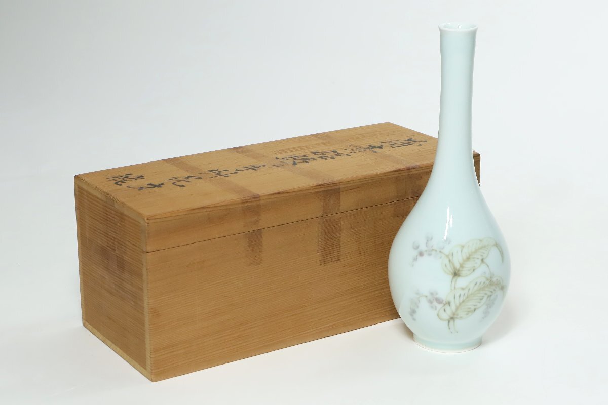 | ・年木庵 松本佩山 薄青磁絞り手花文 瓶 共箱 /有田焼 青瓷 壺 花瓶 花器 鶴首 | ||||||||||