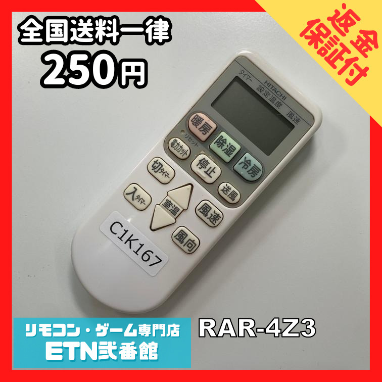 C1K167 【送料250円】エアコン リモコン / 日立 ヒタチ HITACHI RAR-4Z3 動作確認済み★即発送★ * 冷房 暖房