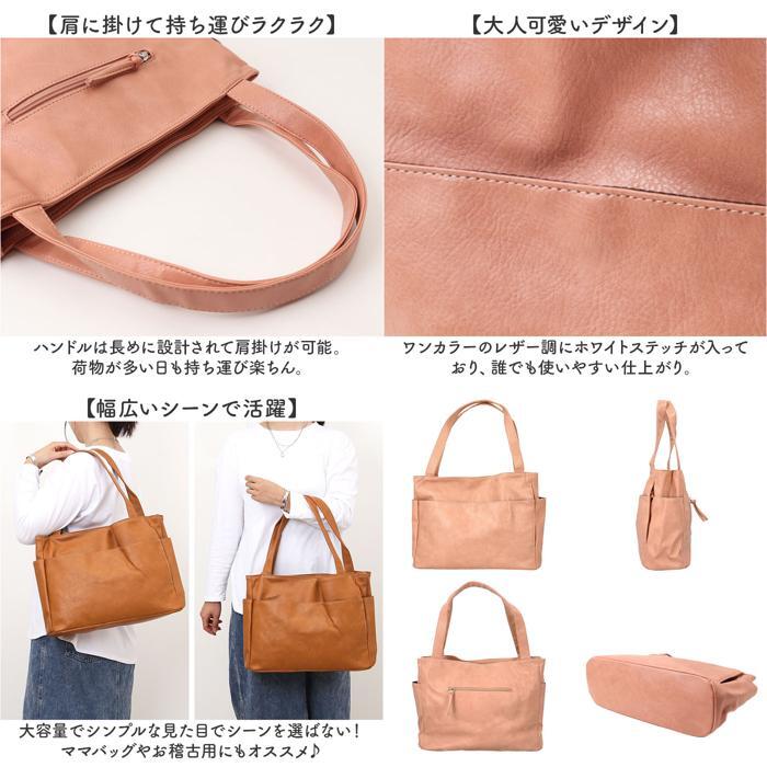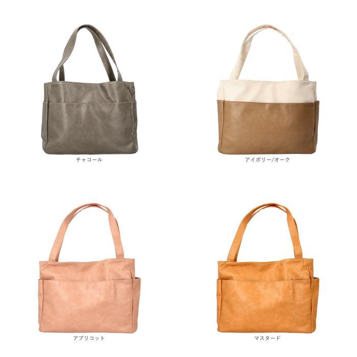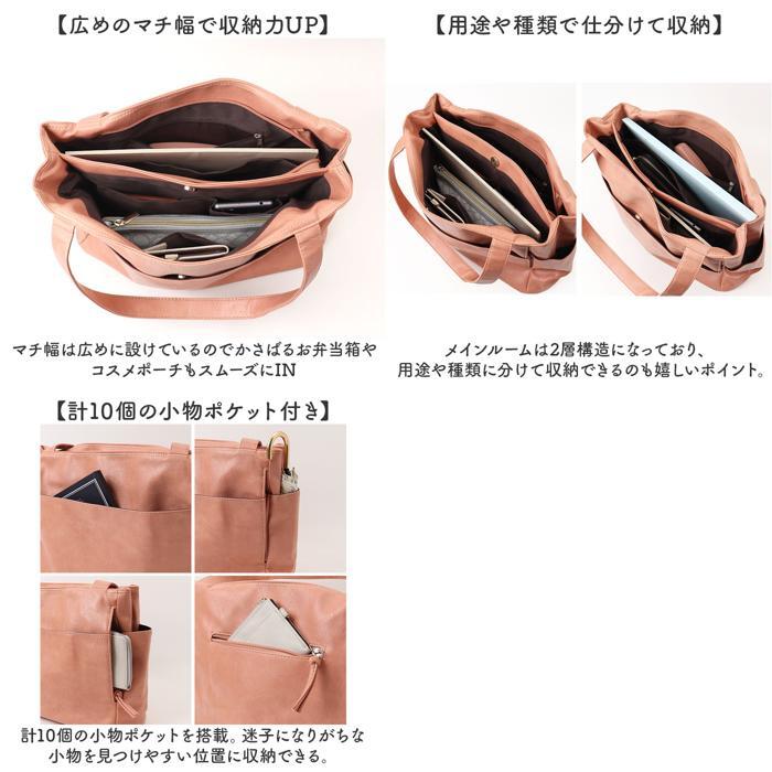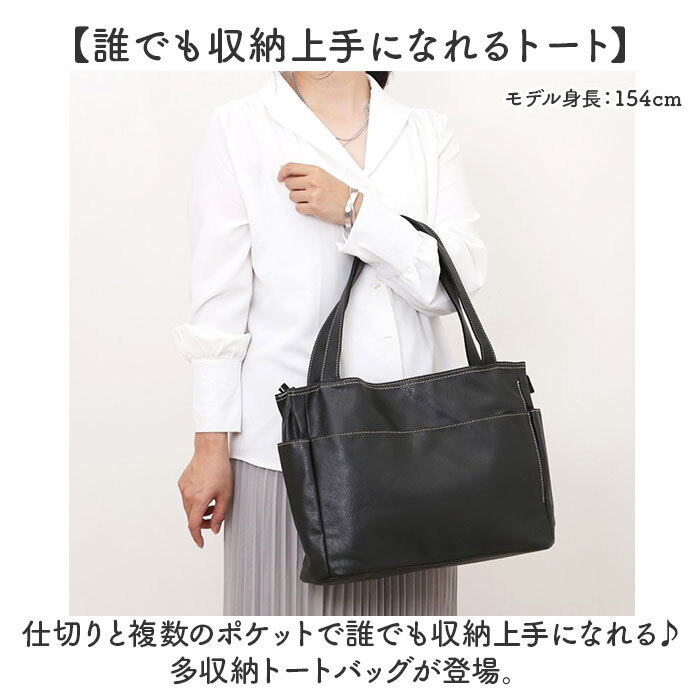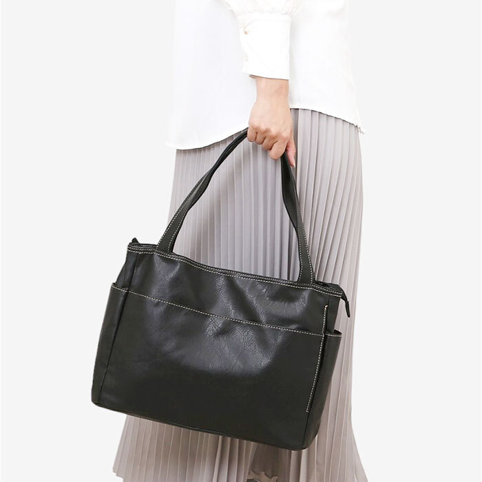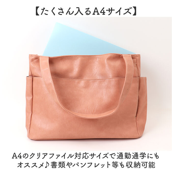 | 商品説明 | ・・【誰でも収納上手になれるトート】 ・仕切りと複数のポケットで誰でも収納上手になれる♪多収納トートバッグが登場。 ・【たくさん入るA4サイズ】 ・A4のクリアファイル対応サイズで通勤通学にもオススメ♪書類やパンフレット等も収納可能 ・【広めのマチ幅で収納力UP】 ・マチ幅は広めに設けているのでかさばるお弁当箱やコスメポーチもスムーズにIN ・【用途や種類で仕分けて収納】 ・メインルームは2層構造になっており、用途や種類に分けて収納できるのも嬉しいポイント。 ・【計10個の小物ポケット付き】 ・計10個の小物ポケットを搭載。迷子になりがちな小物を見つけやすい位置に収納できる。 ・【肩に掛けて持ち運びラクラク】 ・ハンドルは長めに設計されて肩掛けが可能。荷物が多い日も持ち運び楽ちん。 ・【大人可愛いデザイン】 ・ワンカラーのレザー調にホワイトステッチが入っており、誰でも使いやすい仕上がり。 ・【幅広いシーンで活躍】 ・大容量でシンプルな見た目でシーンを選ばない!ママバッグやお稽古用にもオススメ♪ ・【ポケット仕様】 ・メインルーム(フロント側)・・・オープンポケット×3 ・メインルーム(背面側)・・・ファスナーポケット×1、仕切りポケット×1 ・フロント・・・オープンポケット×1、ファスナーポケット×1 ・両サイド・・・ファスナーポケット×1ずつ ・背面・・・ファスナーポケット×1 |