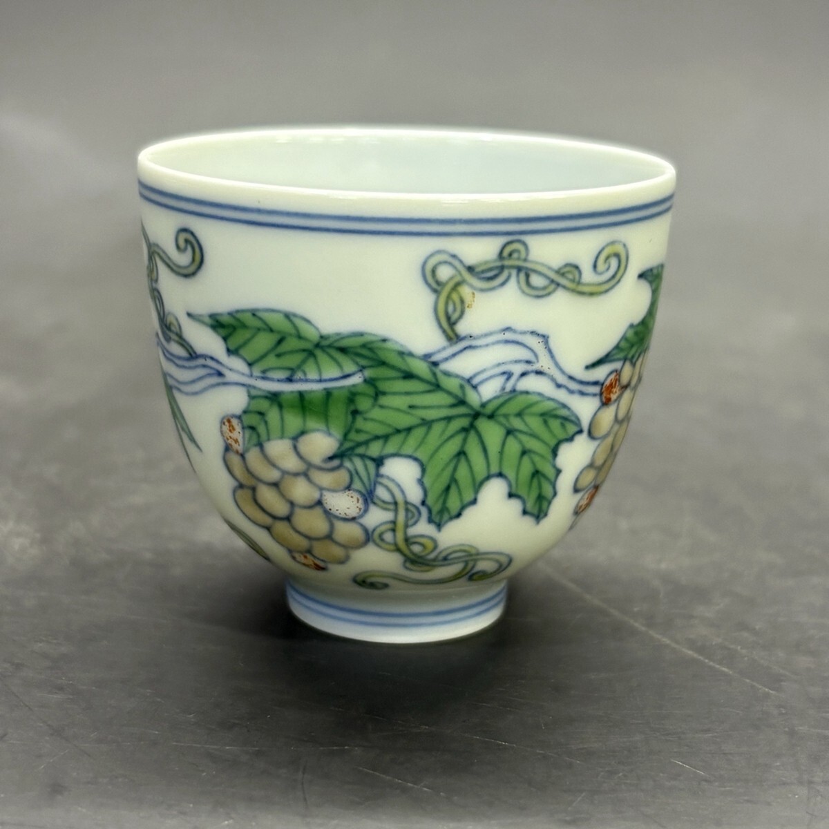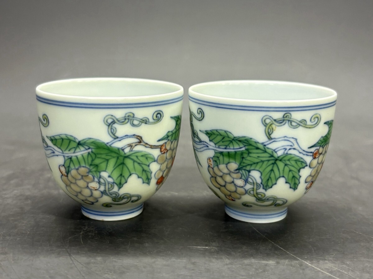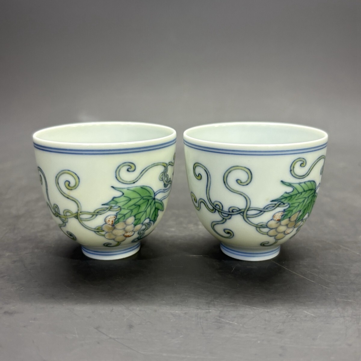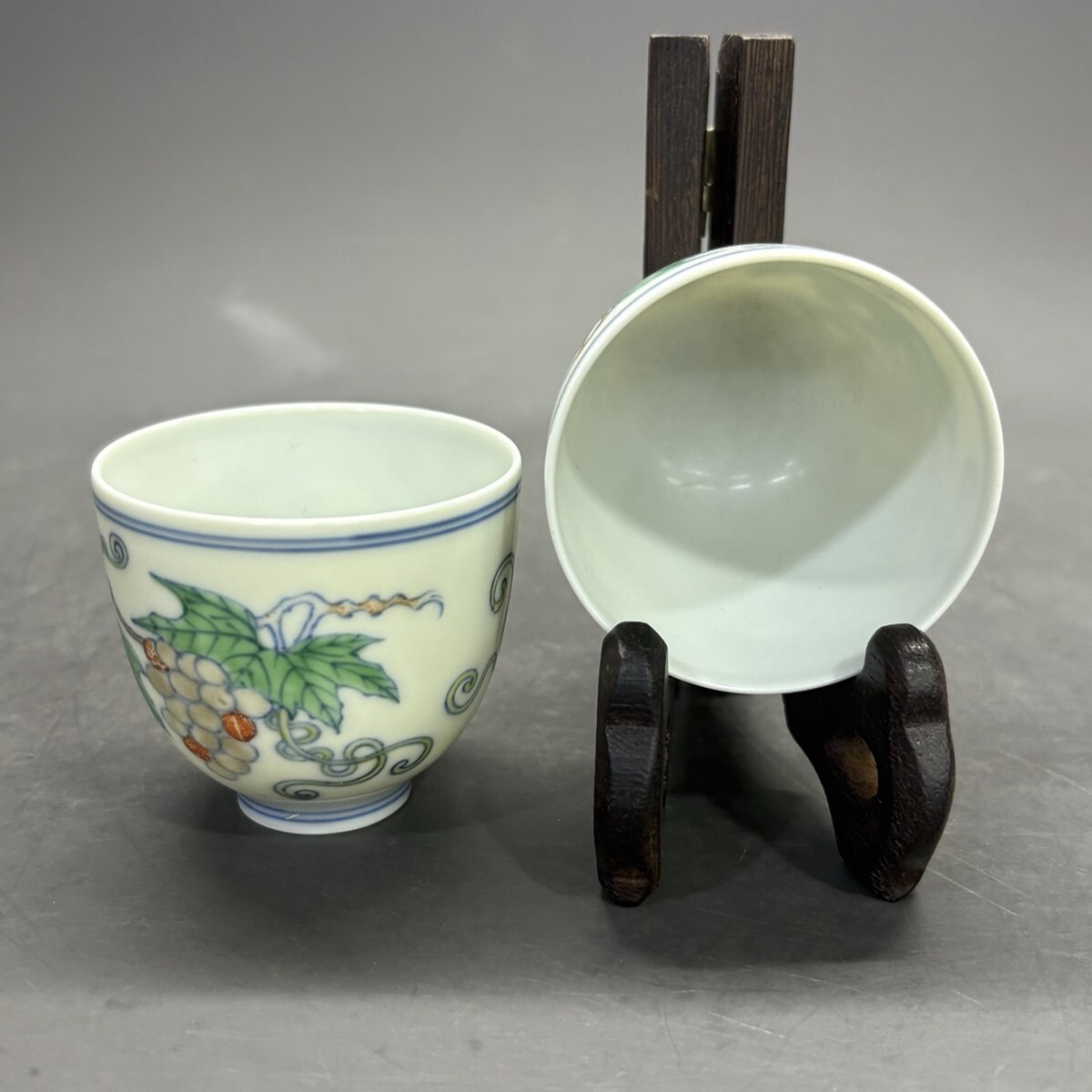 明代 大明成化年製 陶磁器 鬥彩葡萄紋 対杯【仁】染付 置物擺件 古賞物 古美術 中国古玩 蔵出