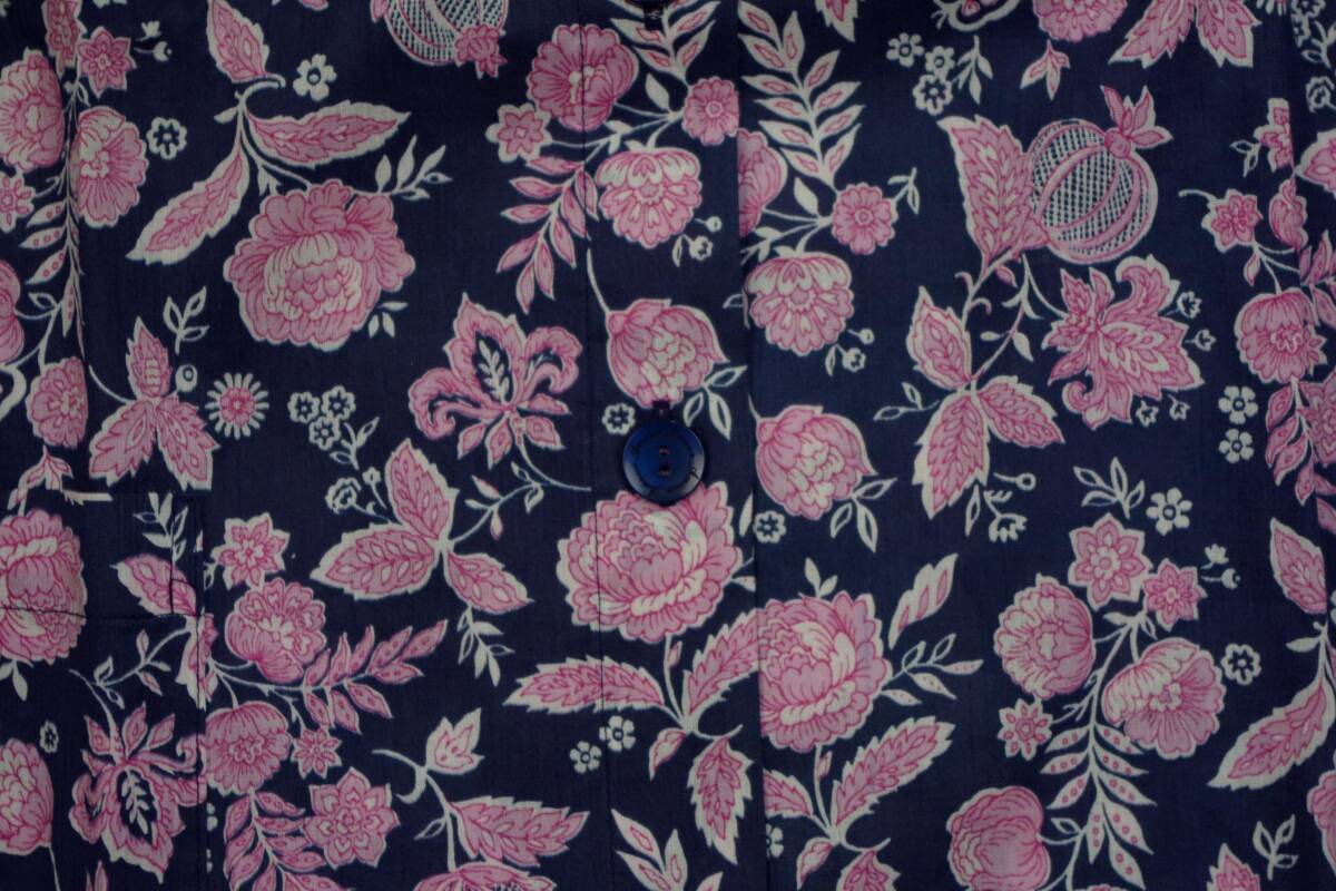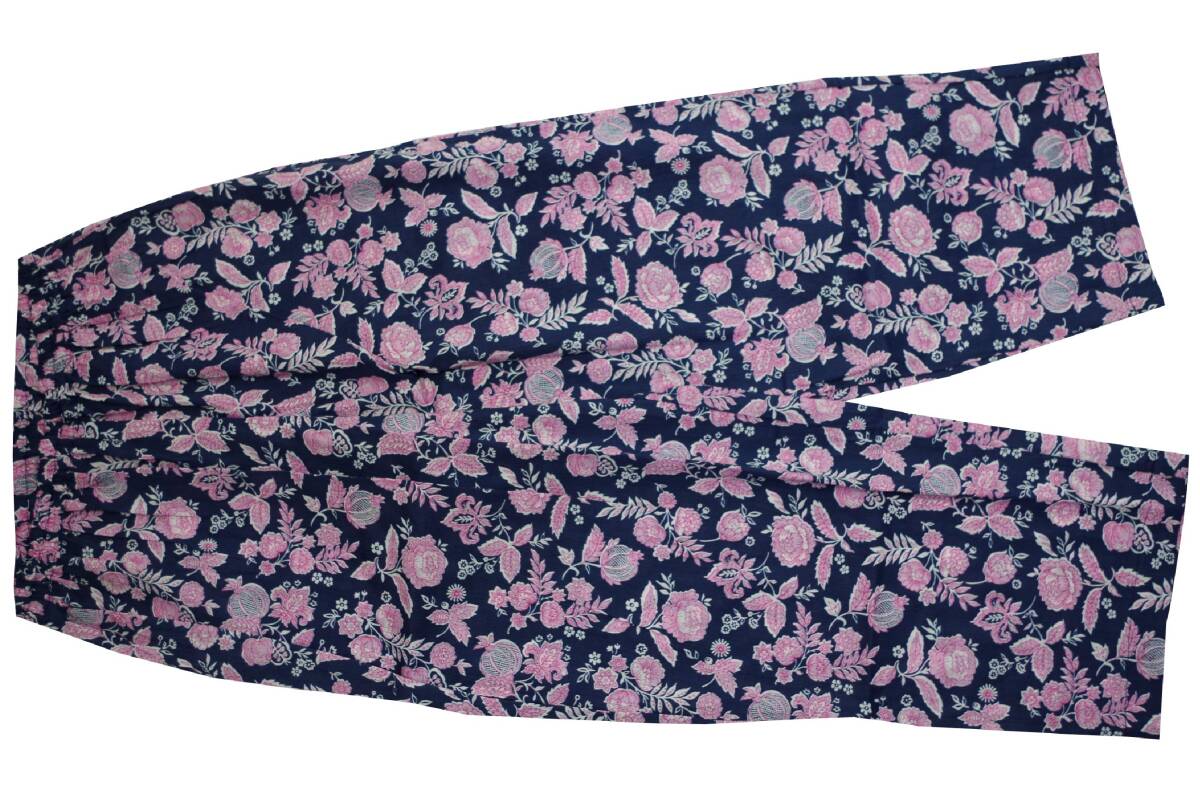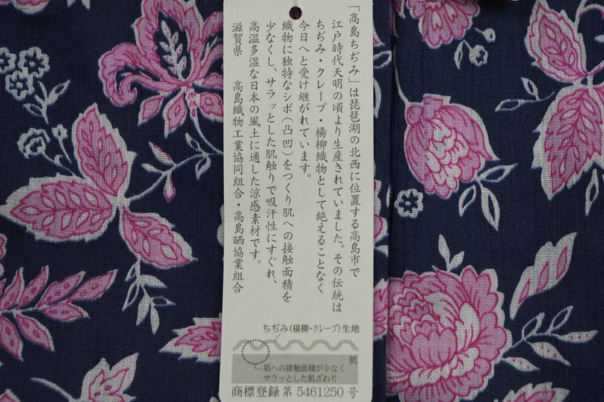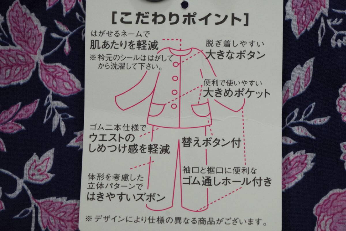 サイズは150MP。身長150㎝(145㎝~155㎝)の方を対象に作られています。前開き、7分袖、ロングパンツ。バスト79-87㎝。色はネイビー+ピンク。素材は綿100%の涼感素材、高島ちぢみが使用されています。
