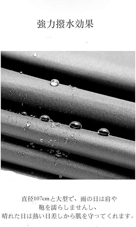 照り付ける夏の太陽光、紫外線を強力にカット。 水をはじく撥水加工で雨の日も安心。 直径107cmと大型で、