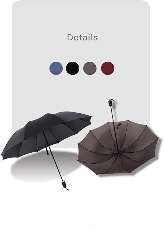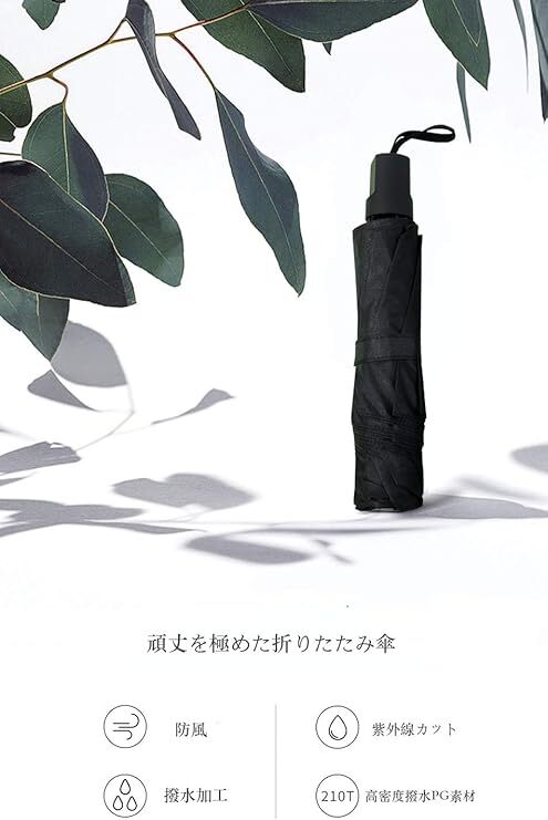 三つ折りでコンパクト、傘収納袋、ストラップ付きで持ち運びに便利 です。 生地は高密度撥水PG素材で、