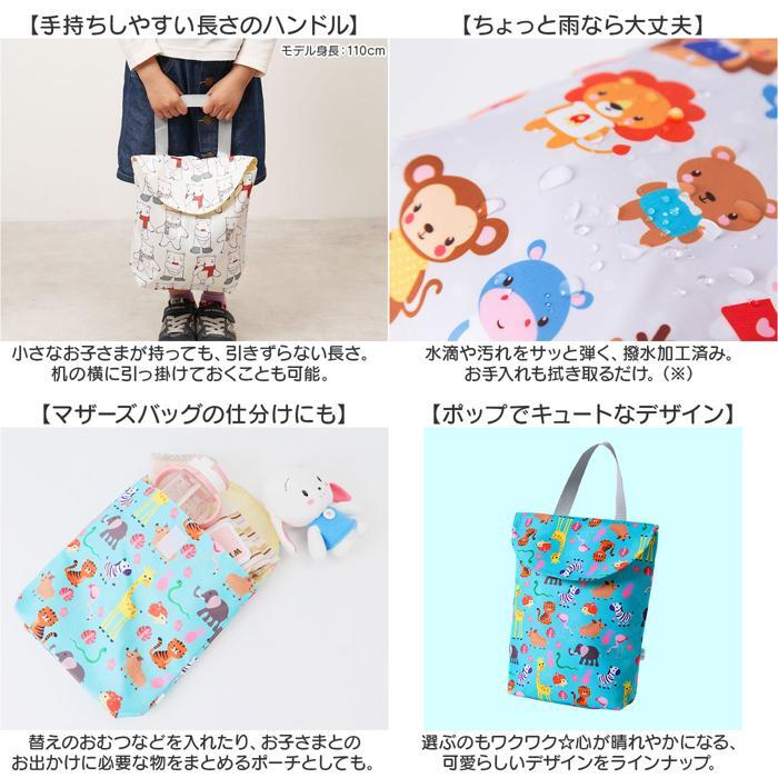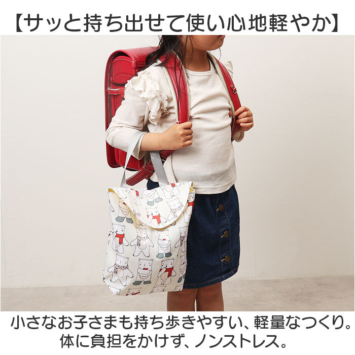 | 商品説明 | ・・【通園・通学のお供にぴったり】 ・上履きなどの持ち帰りに。サブ使いにおすすめの「多目的バッグ」。 ・【サッと持ち出せて使い心地軽やか】 ・小さなお子さまも持ち歩きやすい、軽量なつくり。体に負担をかけず、ノンストレス。 ・【開閉スムーズな面ファスナー式】 ・フラップは面ファスナーで着脱。大きく開いて出し入れしやすく、閉じれば飛び出しをガード。 ・【シューズがすっぽり収まるサイズ】 ・マチ付きで、上履きや替えのシューズを入れるのに最適。程よい大きさで、スマートに持ち歩き。 ・【サクッと取り出せて迷子知らず】 ・背面にポケットを1つ配置。細々した物も、必要な時にすぐ手に取れる◎ ・【手持ちしやすい長さのハンドル】 ・小さなお子さまが持っても、引きずらない長さ。机の横に引っ掛けておくことも可能。 ・【ちょっと雨なら大丈夫】 ・水滴や汚れをサッと弾く、撥水加工済み。お手入れも拭き取るだけ。 ・(※)完全防水ではありません。拭き取るだけでは汚れが落ちない時は、手洗いしてください。 ・【マザーズバッグの仕分けにも】 ・替えのおむつなどを入れたり、お子さまとのお出かけに必要な物をまとめるポーチとしても。 ・【ポップでキュートなデザイン】 ・選ぶのもワクワク☆心が晴れやかになる、可愛らしいデザインをラインナップ。 ・【ポケット仕様】 ・背面:面ファスナーポケット×1 |