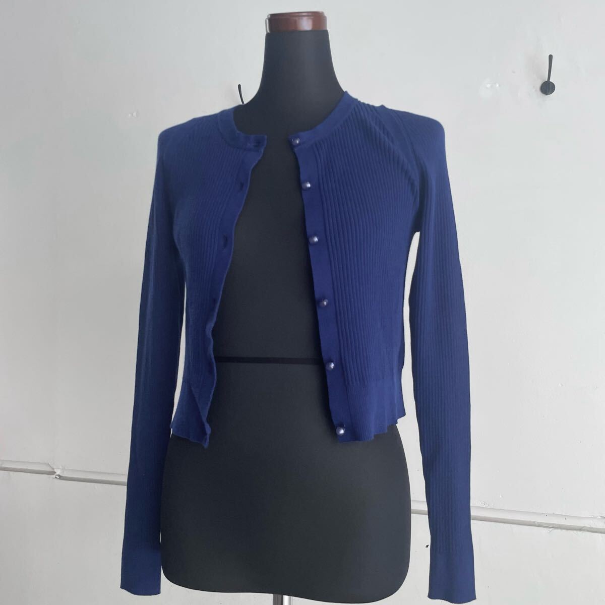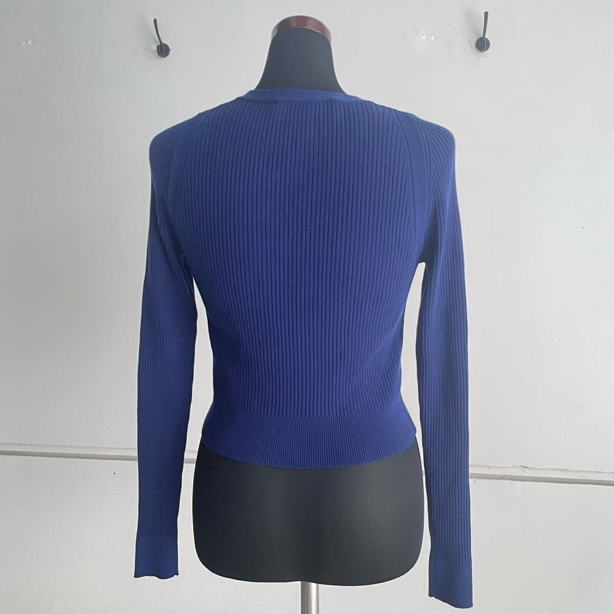 リブ編みデザインのブルーのカーディガンと半袖ニットのセットです。どちらも伸縮性あり。