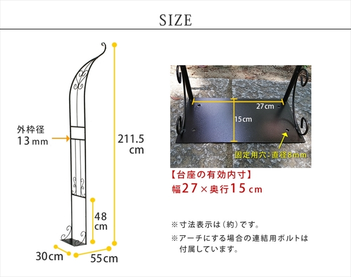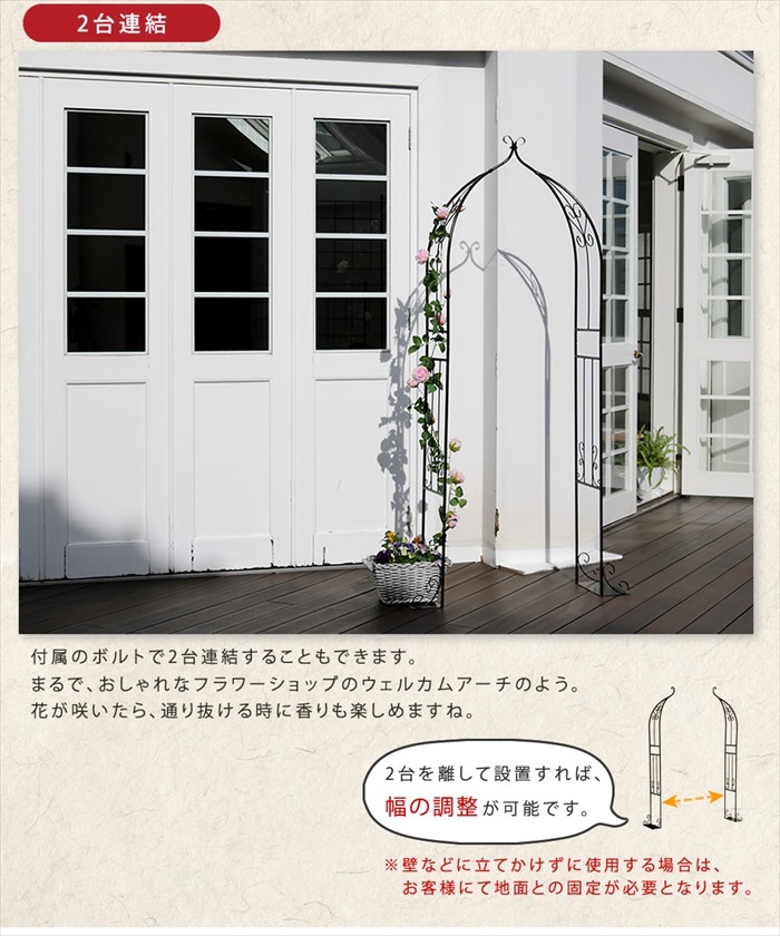 | ベランダでも憧れのバラアーチが叶う♪ 繊細で軽やかなハーフアーチ。 「バラアーチに憧れるけど、普通のアーチは大きすぎて…」 そんな声にお応えして、優雅な雰囲気はそのままに、すっきり省スペースのハーフアーチをお作りしました。 設置は簡単、壁に立てかけて、プランターや鉢を重しがわりに乗せるだけ。 台座は設置場所にあわせて、内側・外側どちらに向けてもOKです。 アーチには、フェンスやトレリスとはまた違った、華やかさと物語性があります。 帰宅するたび、室内からお庭を見るたびに、時間を忘れるような癒しのひとときを与えてくれることでしょう。 |