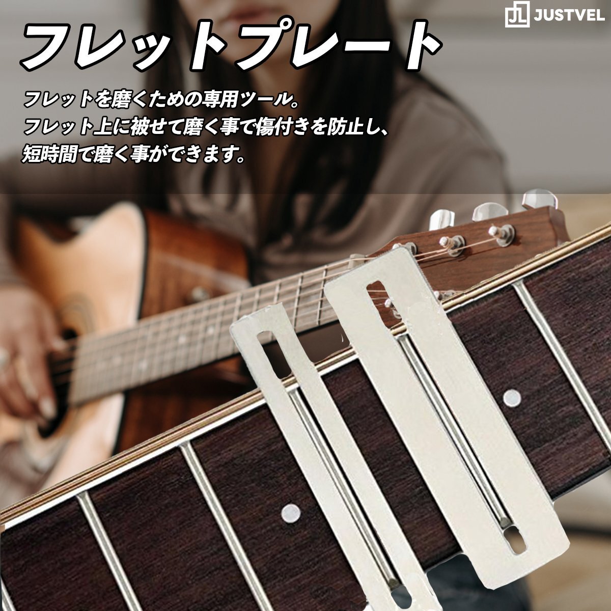 ・【愛用のギターのメンテナンスに】ヤスリ、プレート、サンディングブロックのセットです。フレット磨きやメンテナンスに必要な工具をセットにしました。フレットの磨きやバリ取り、研磨作業を実施することでギターの音や演奏性を向上させます。・【フレットプレート】フレット磨き時に指板を保護するためのフレットプレートです。ステンレス製のプレートをフレット上に設置することでヤスリが指板に傷をつけるのを防ぎます。作業がより簡単かつ安全に行えます。・【サンディングブロック】フレット磨きの仕上げに使用するサンディングブロックです。長方形の形状で4つの面にそれぞれ異なる粒度(400、600、1000、1200)のサンドペーパーが付いており、効率的に磨き上げが可能です。フレットの表面を滑らかに仕上げる事でより快適でスムーズな演奏ができます。