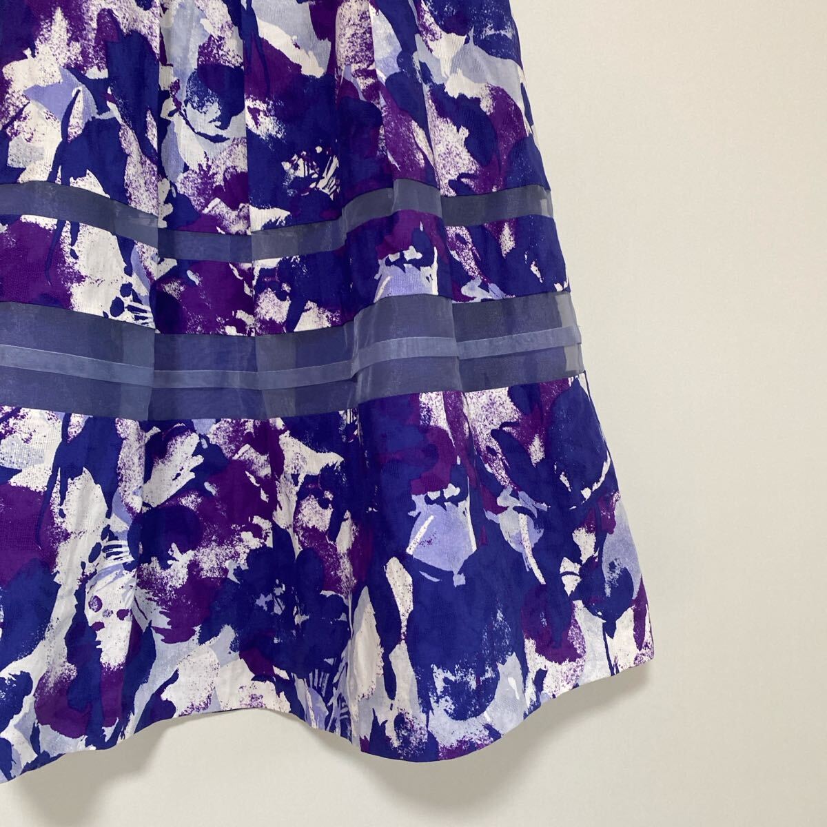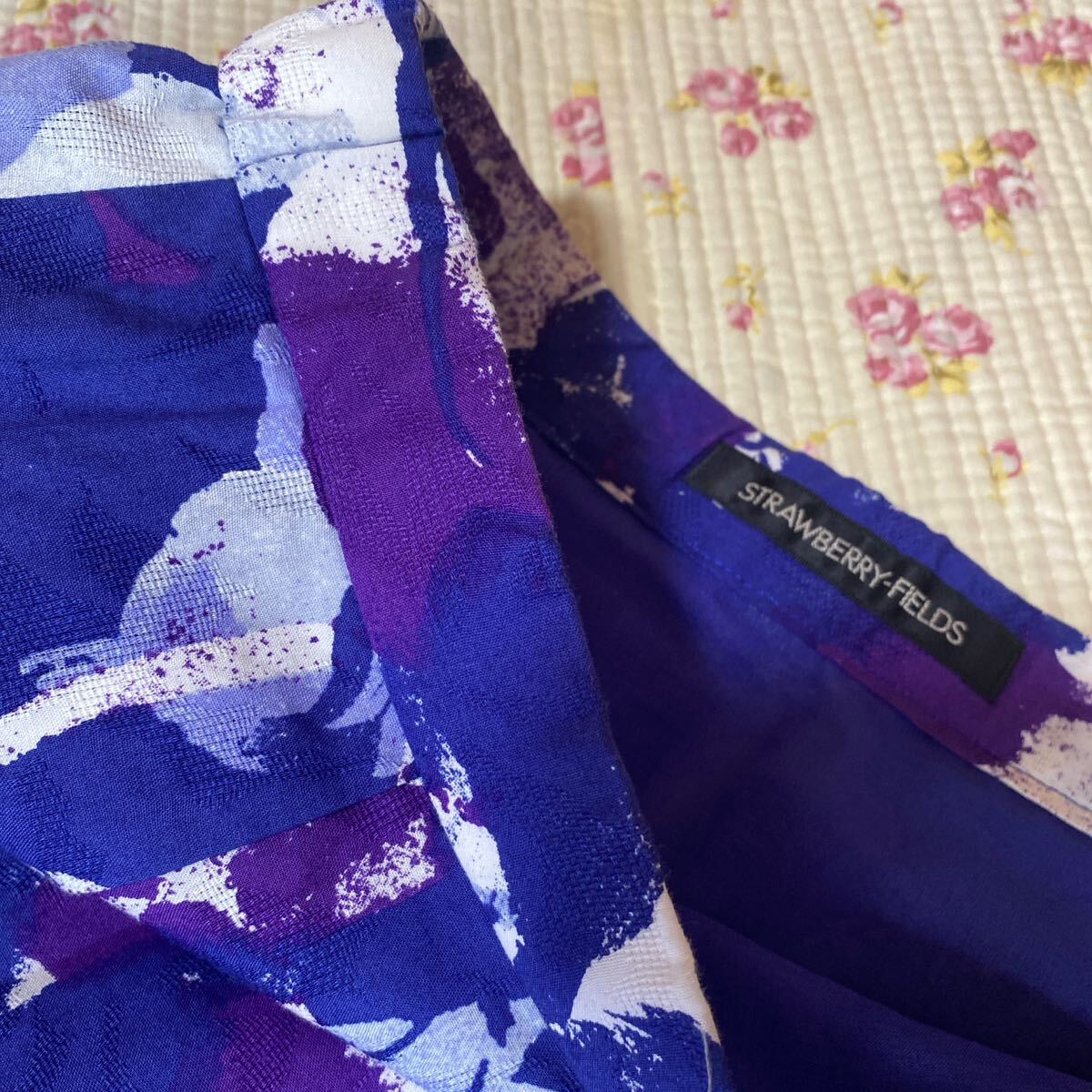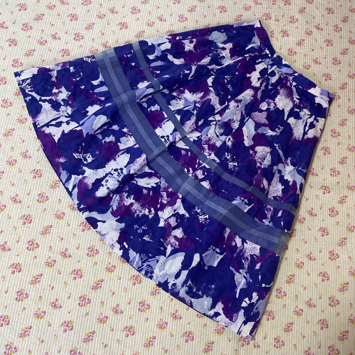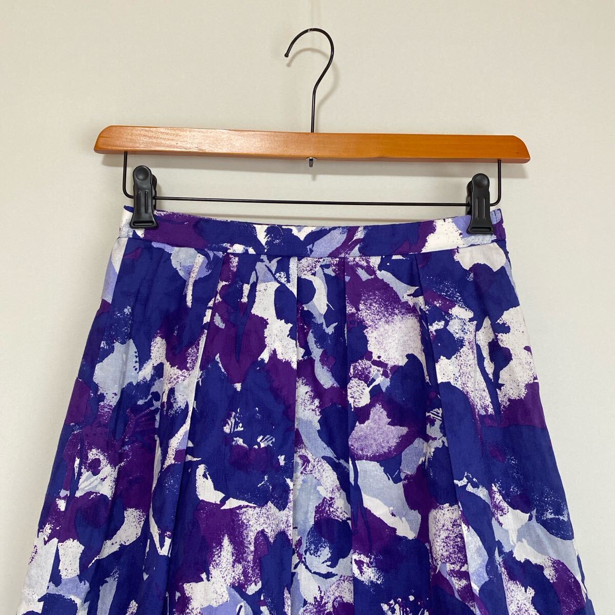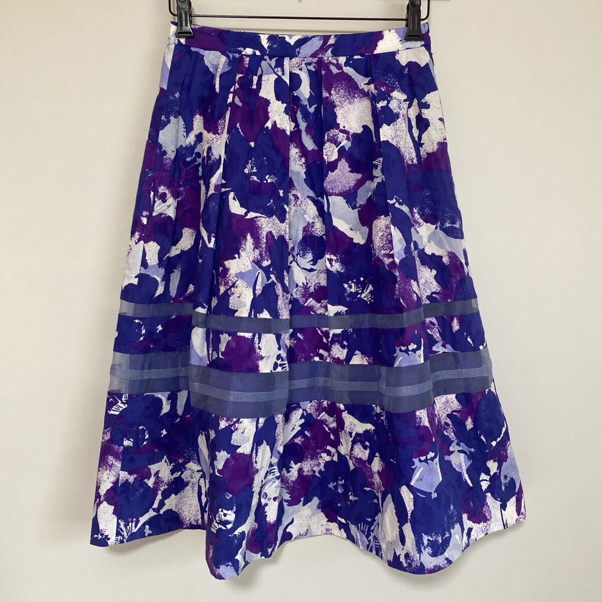 ストロベリーフィールズ(STRAWBERRY-FIELDS)のお品です。爽やかなブルー(青)×パープル(紫)の総柄がデザインされています。歩くたびに揺れるような軽やかで女性らしいシルエット。上品なフェミニンスタイルを特徴とし、柄も派手すぎず、大人の女性が着用しやすい落ち着いたトーンのロングスカートです。上品で、清楚な雰囲気で着こなせます。お色は画像でご確認下さい。実際のお色が良く出ています。ブルー(青)×パープル(紫)の総柄です。春夏シーズンに活用できる、上質生地が使われています。スカート、ポケット×0。左サイドファスナー。スリットなし。裏地付。染み、汚れ、ほつれのないとてもきれいなスカートです。日本製。made in japan