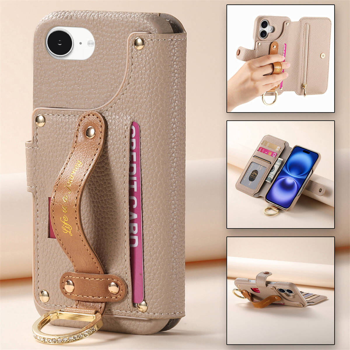 カーキ iPhone16E 用ケース 手帳型 RFID磁気防止 スキミング防止 カードポケット 落ち着いた色 横置き機能 高級PU 気質 全面保護