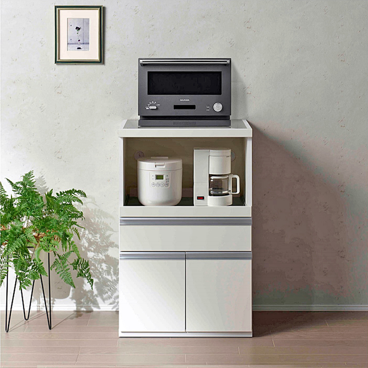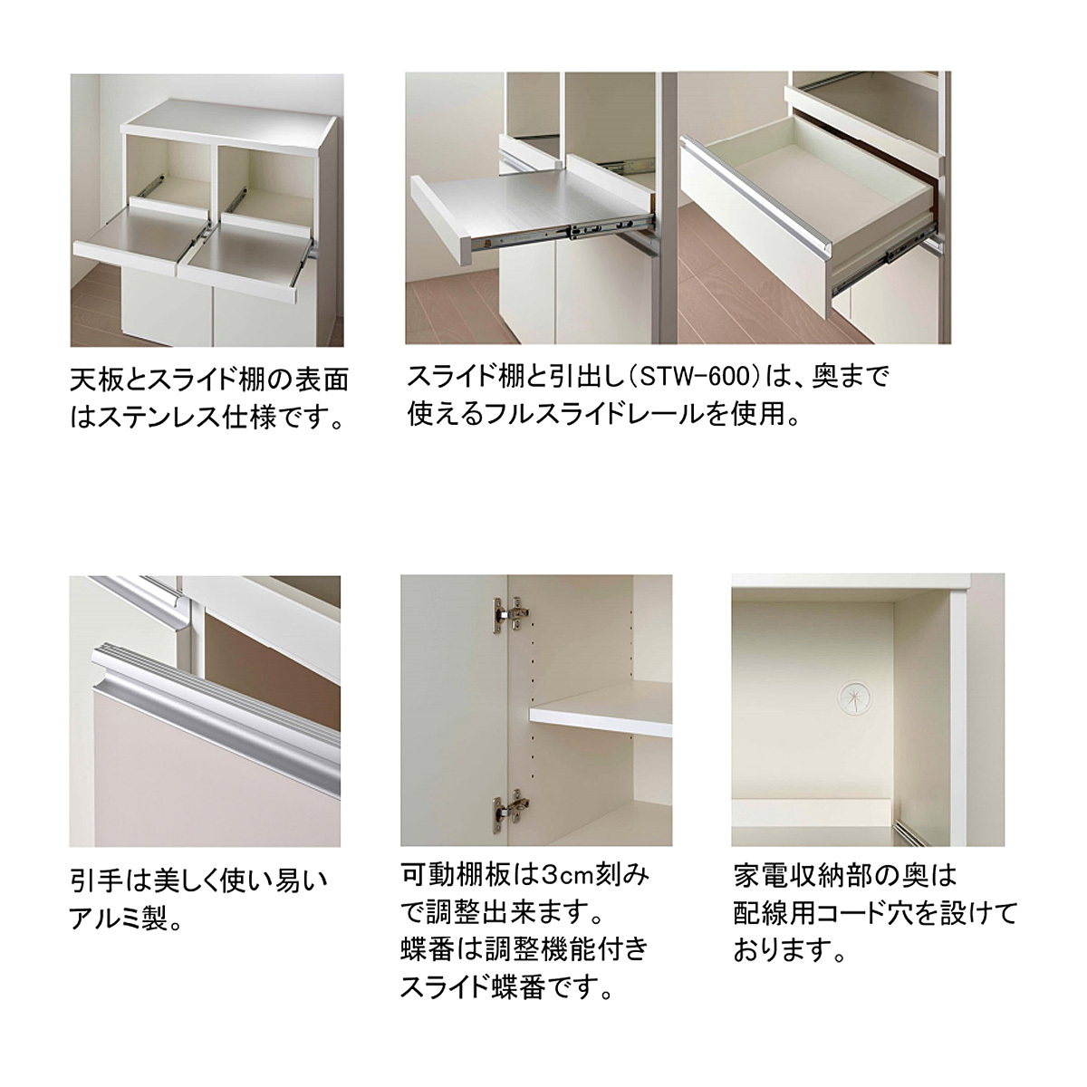 | 特徴 | ●天板とスライド部がステンレス仕様のキッチンカウンター。 ●レンジや家電製品をコンパクトに収納。 ●引出しとスライドトレーは奥まで引き出せる「フルスライドレール仕様」。 ●引出しは、奥の物も取り出しやすいです。 ●収納部の奥は配線用コード穴があります。 ●日本製 ●完成品 |