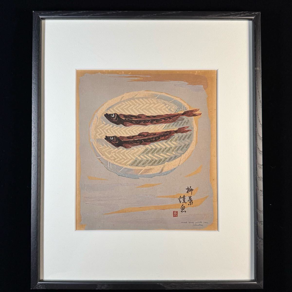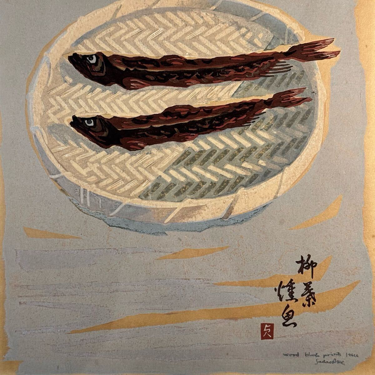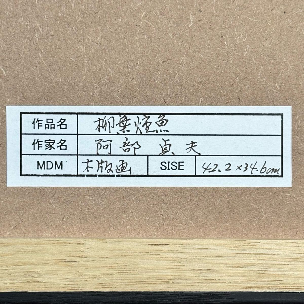真作 阿部貞夫 木版画 『柳葉焼魚』 直筆サイン 額装入り 版画家