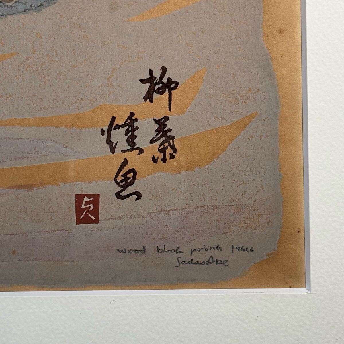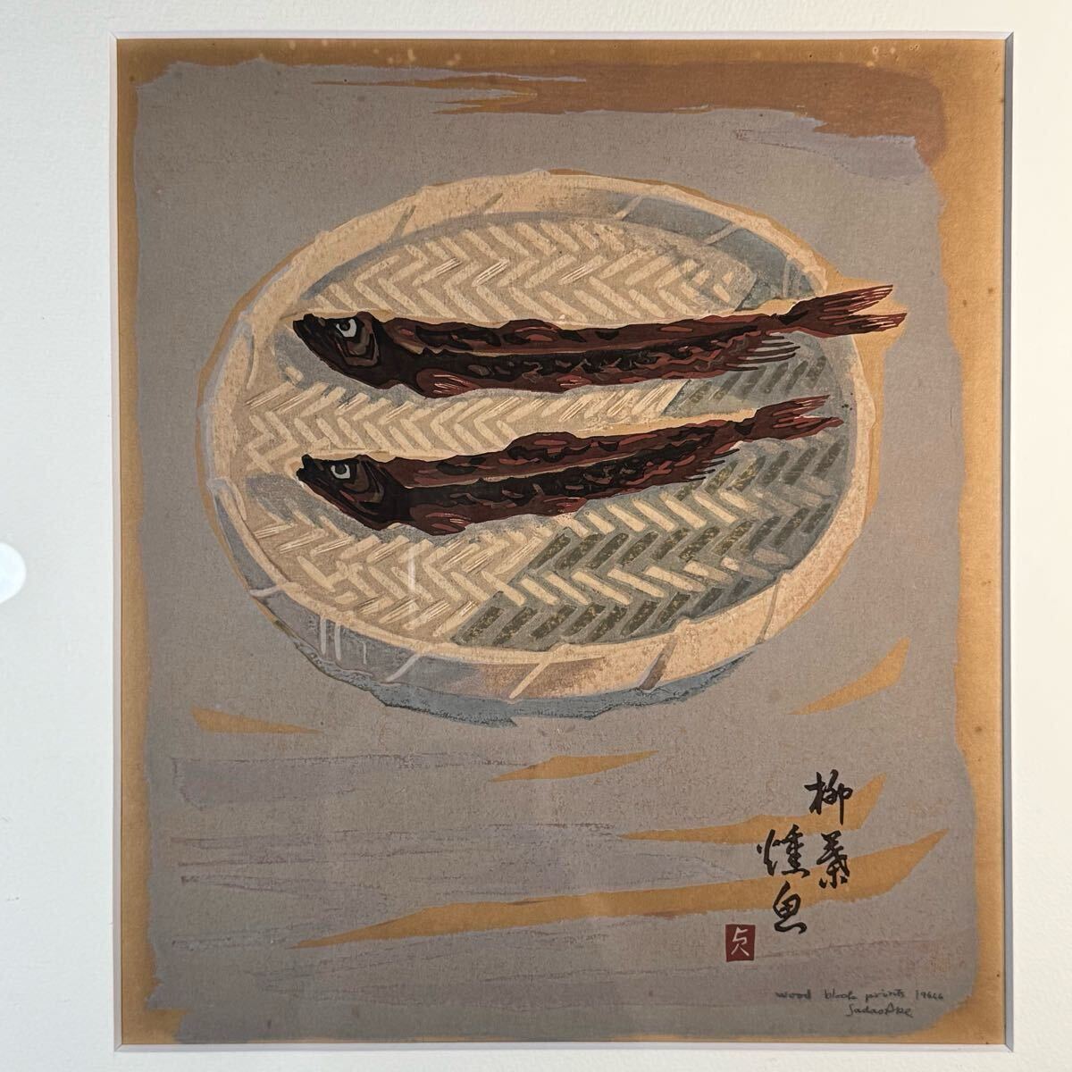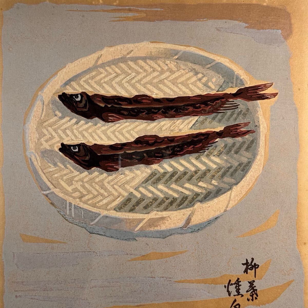 真作 阿部貞夫 木版画 『柳葉焼魚』 直筆サイン 額装入り 版画家