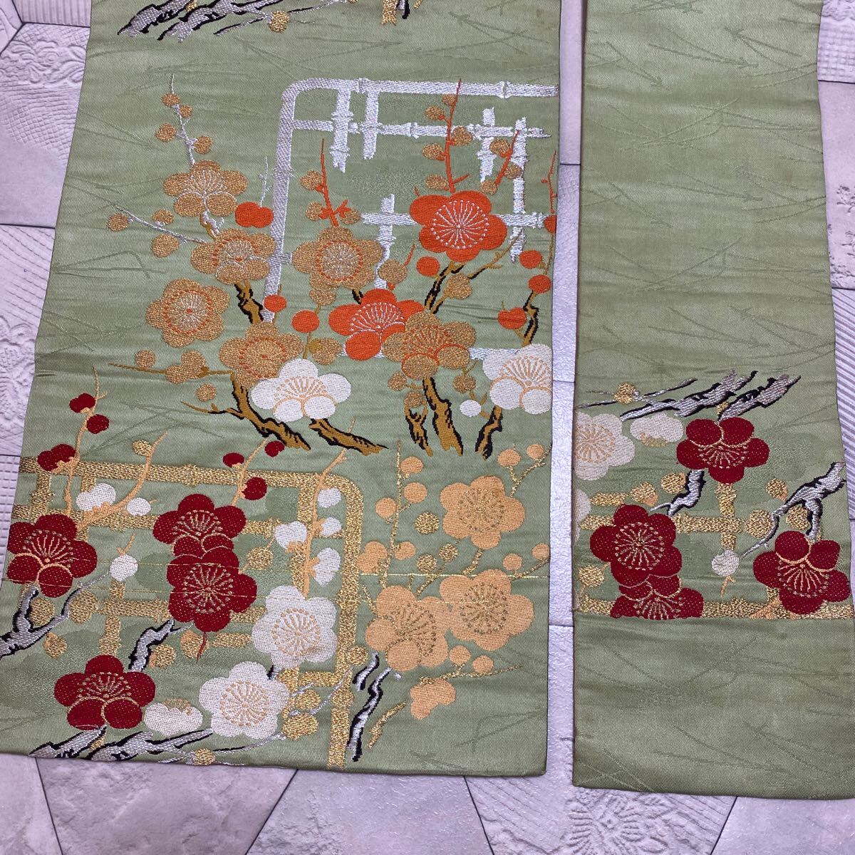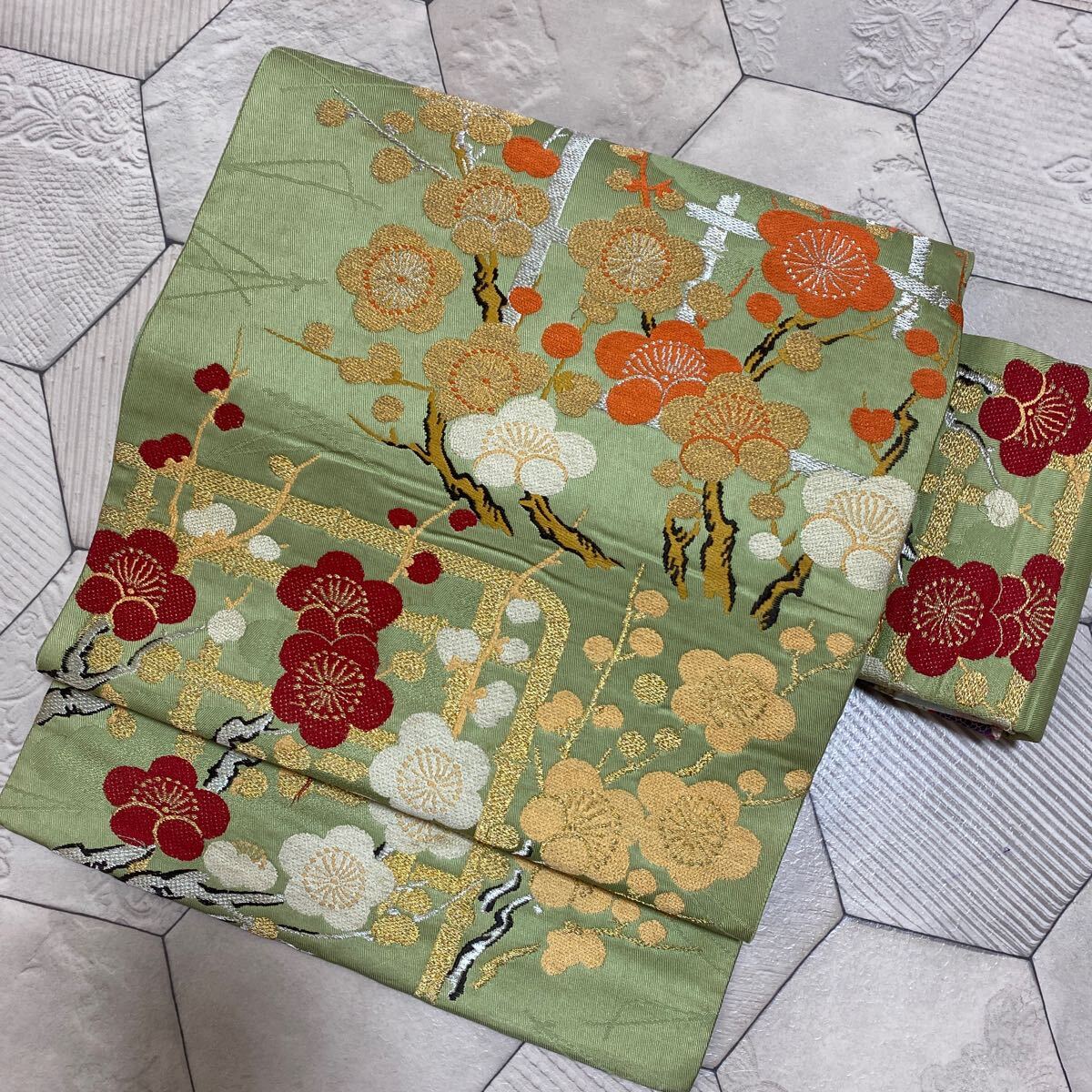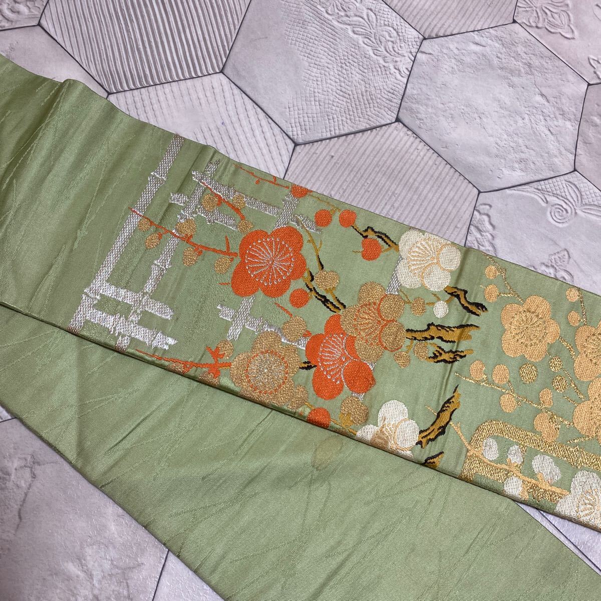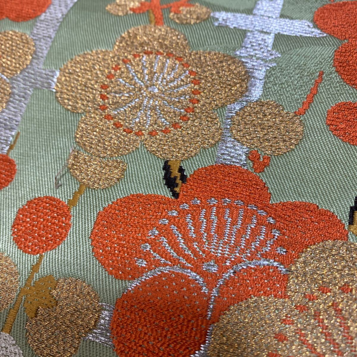 アンティーク 名古屋帯 着物 昭和レトロ 大正ロマン モダン 和洋折衷コーデ リメイク 光沢 グリーン 花 梅 金糸 き17-14w