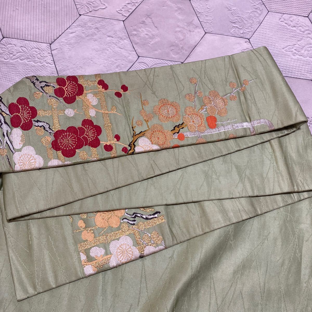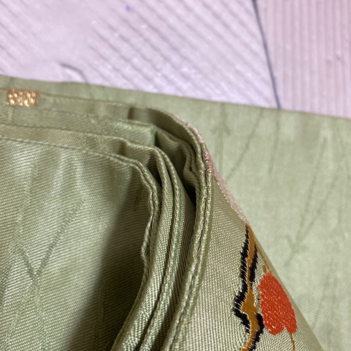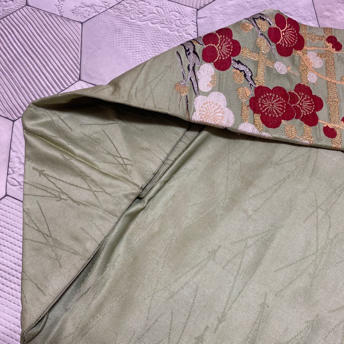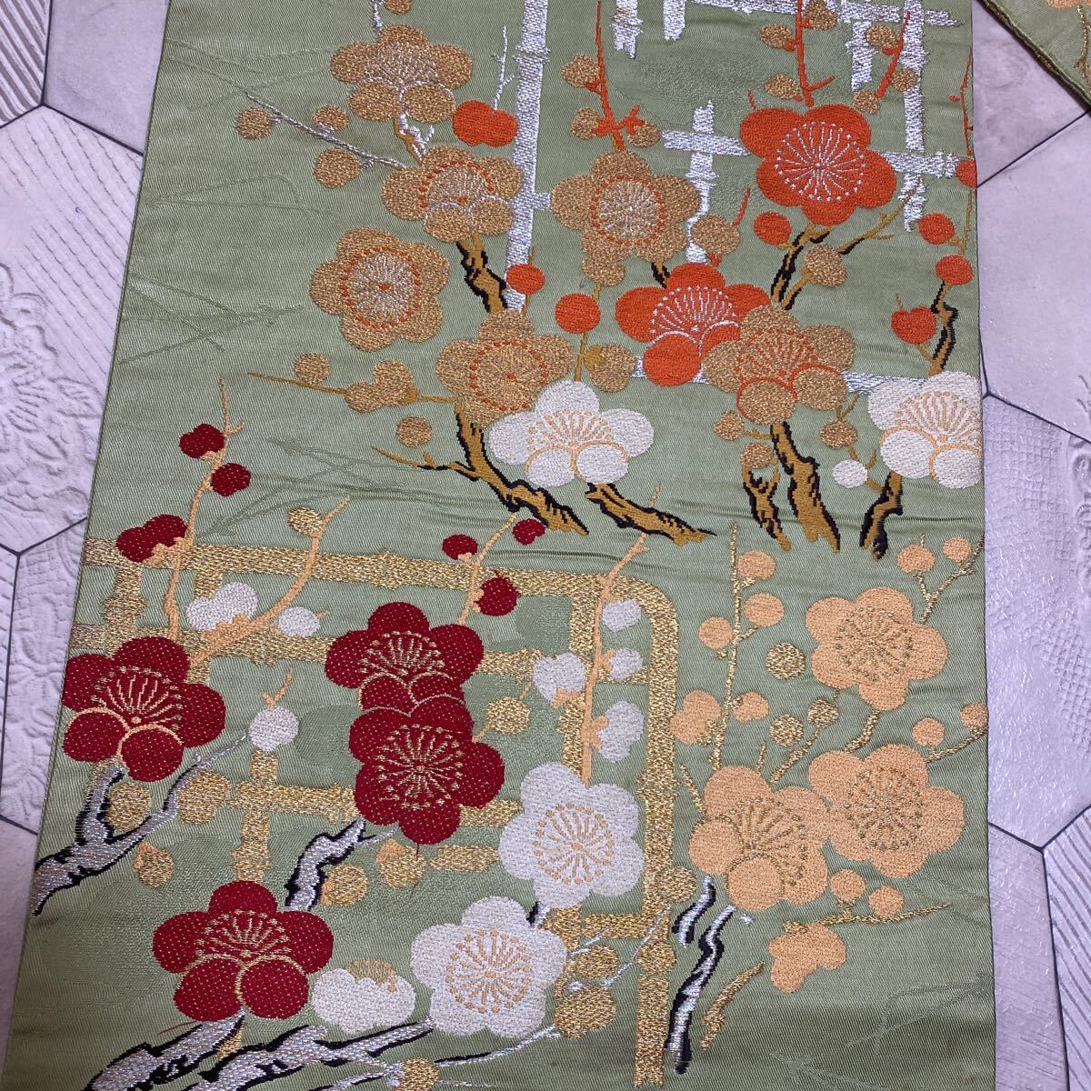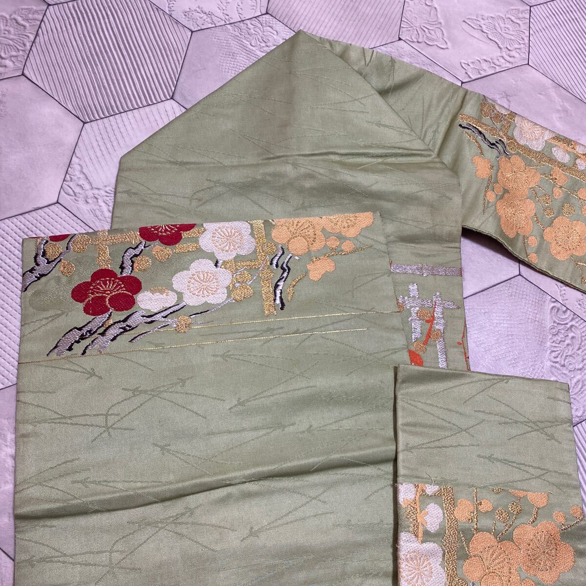 アンティーク 名古屋帯 着物 昭和レトロ 大正ロマン モダン 和洋折衷コーデ リメイク 光沢 グリーン 花 梅 金糸 き17-14w