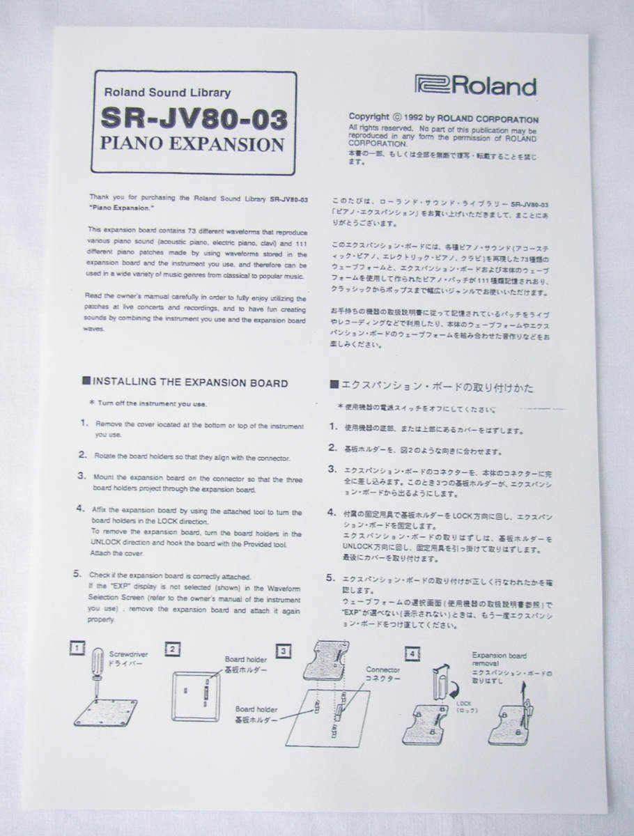 ★商品説明★ ■Roland SR-JV80-03 PIANO EXPANSION BOARDの出品です。 ◆使えるモデル:JV-80,JV-90,JV-1000,XP-30,XP-50,XP-60,XP-80,JV-880,JD-990,JV-1010,JV-1080,JV-2080,FANTOM FA76,XV-88,XV-3080,XV-5080. ■動作確認しております。製品の方は問題なく動作しておりましたが、あくまでも中古扱いとさせて頂きます。 ★支払方法★ Yahooかんたん決済のみ。決済手続き確認後の発送となります。 ★注意事項★ ノークレーム・ノーリターンでお願い致します。※土日曜・祝日は発送できません。予めご了承下さい。 ★発送詳細★ 恐れ入りますが、振り込み手数料と送料は落札者様のご負担でお願いします。送料は185円です。 |