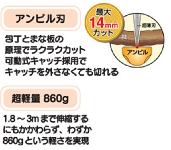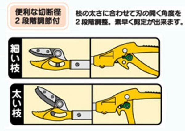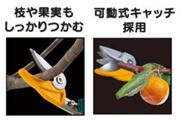 - 特徴:枝や果実をしっかりつかむキャッチ機能付き、刃の角度を2段階に調整可能