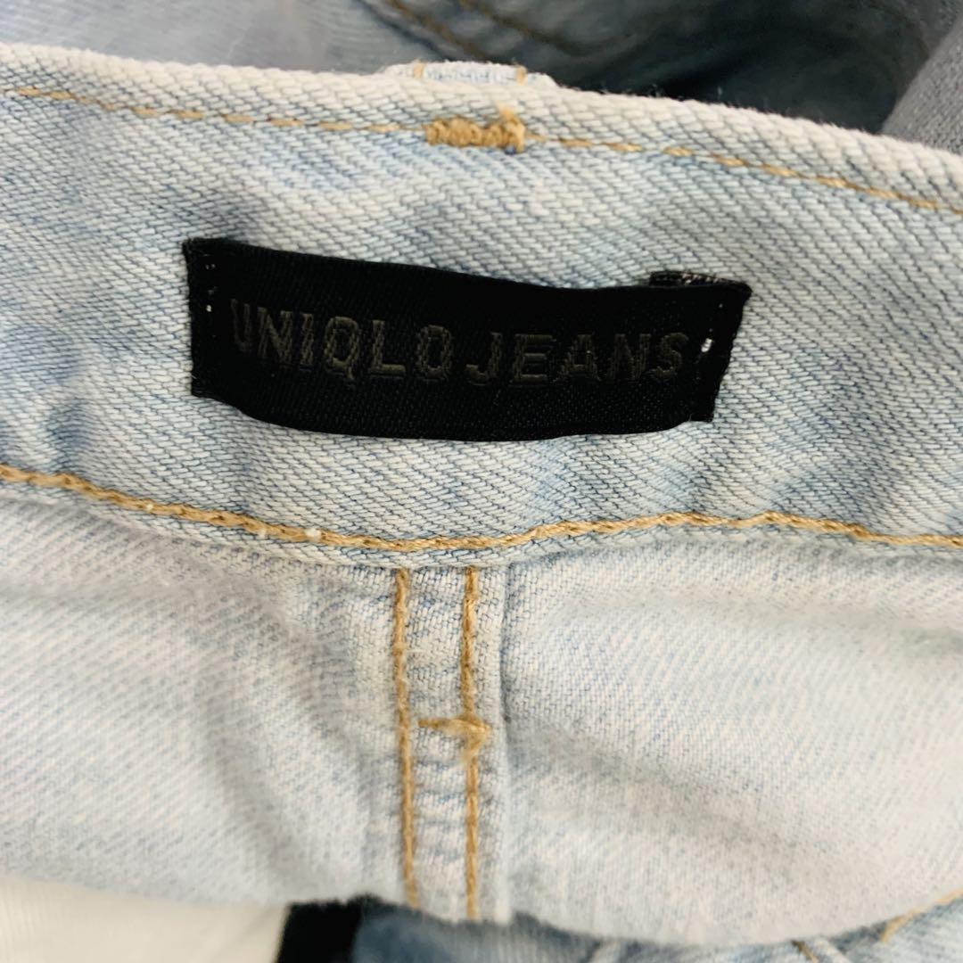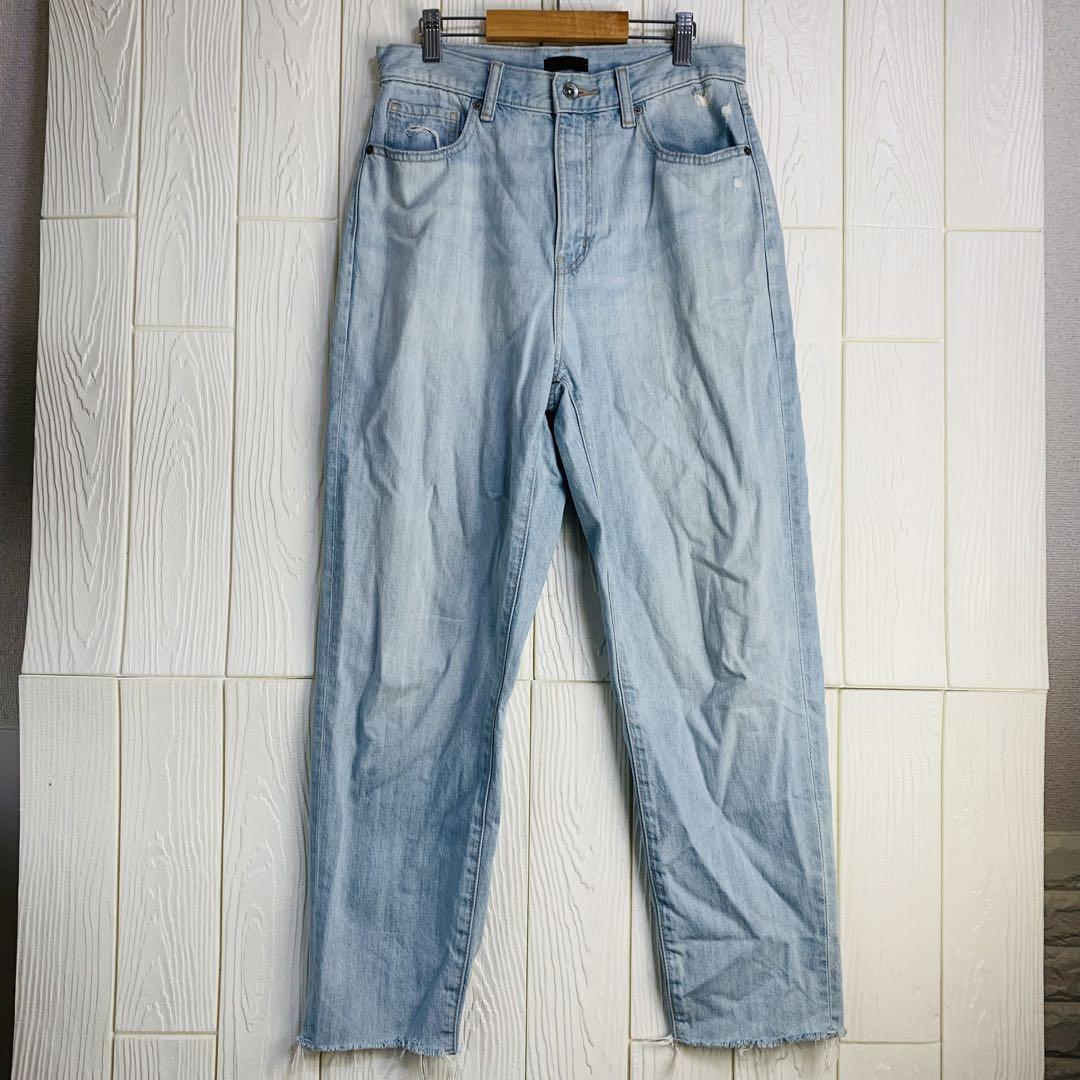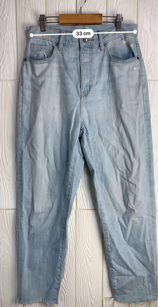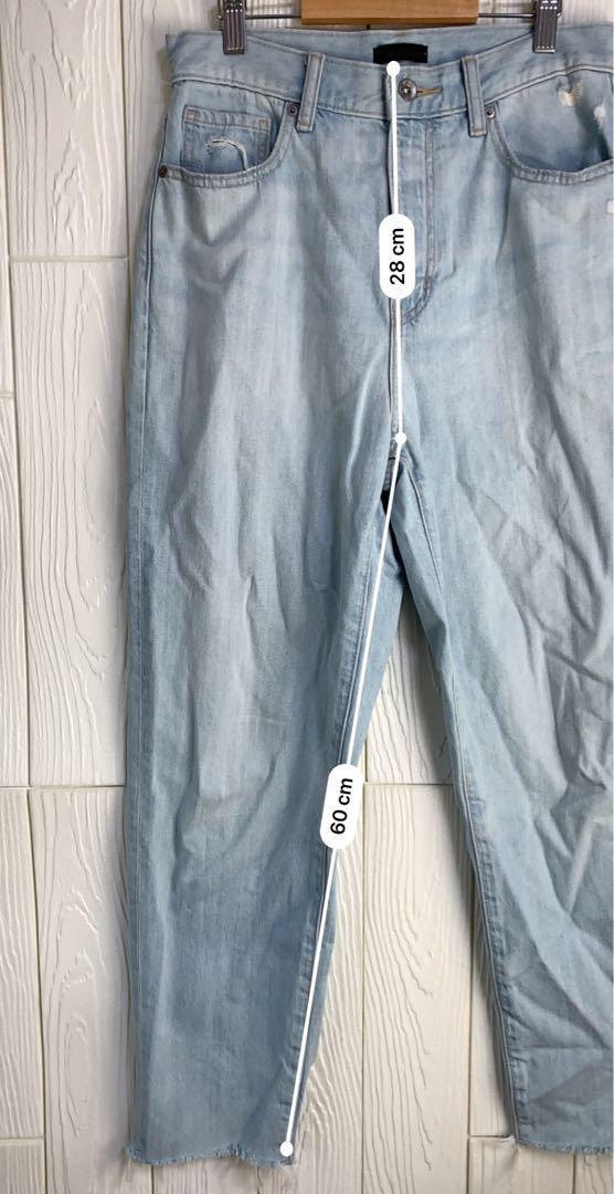 ライトブルーのデニムジーンズ、ウエスト66cm、股下60cmのスタイル。