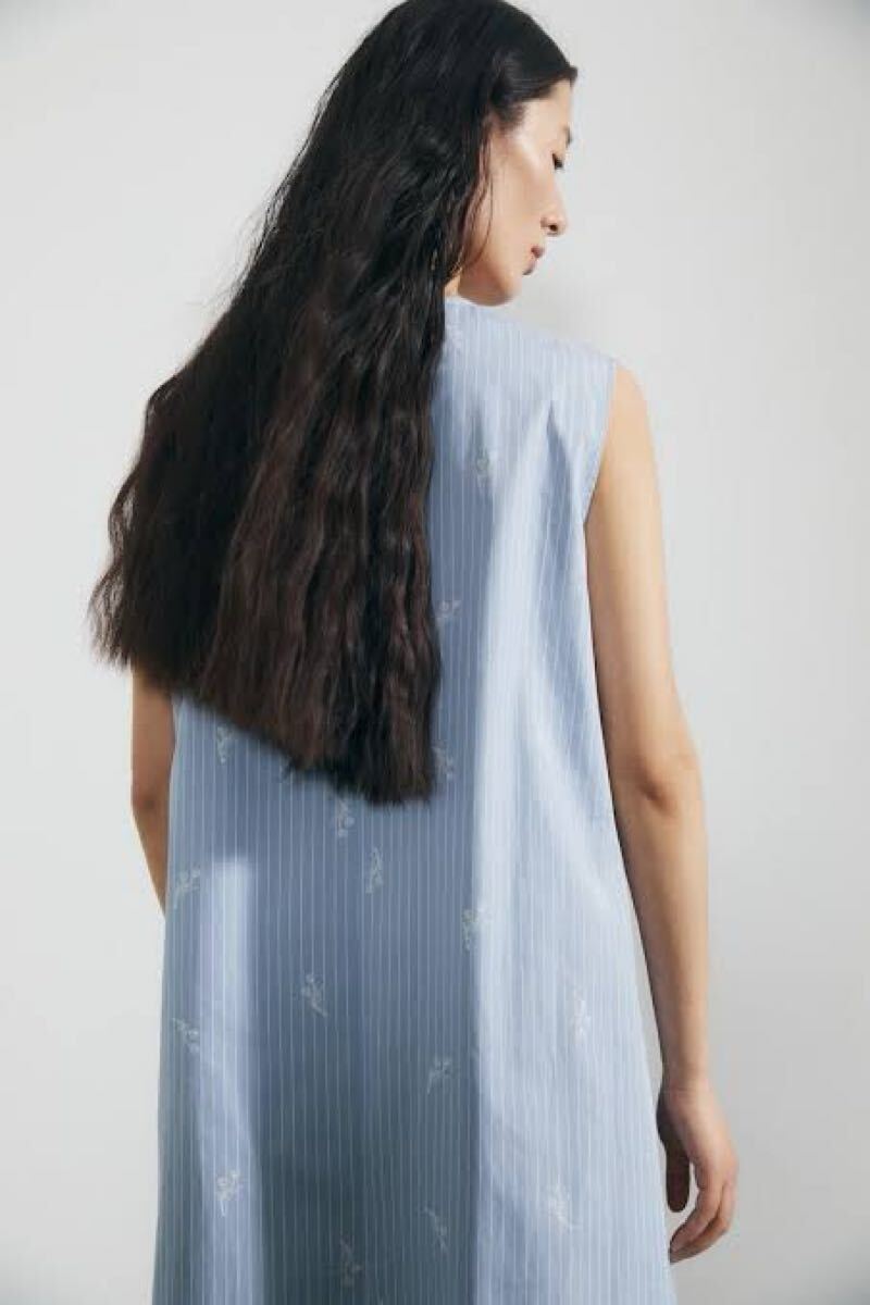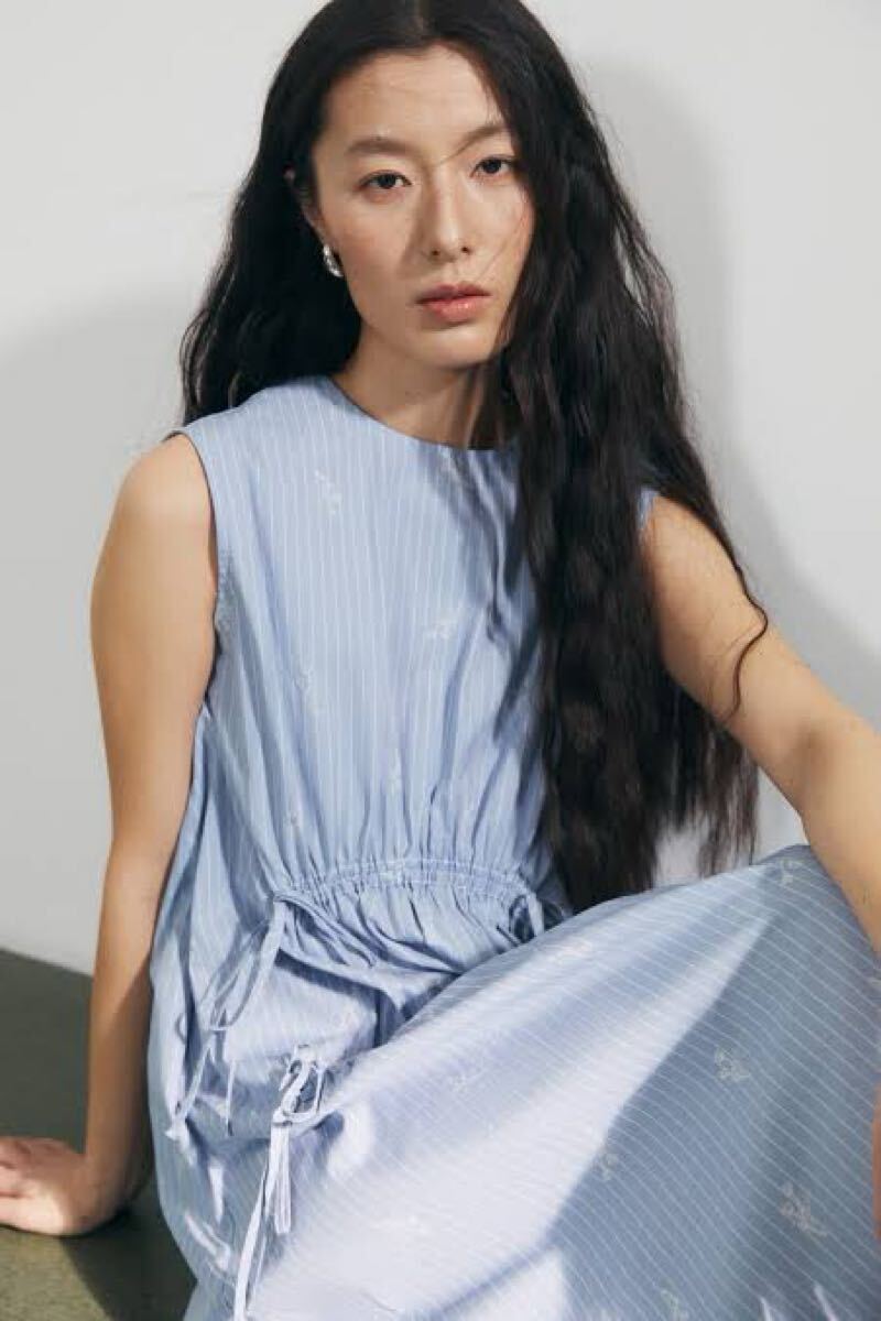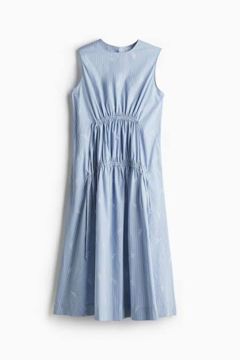 ノースリーブのミモレ丈ワンピース。コットン織物素材。ラウンドネックで、バックにキーホールがあり、ボタンが1つ付いています。ルーズフィット。目立たないサイドポケット付き。フロントの2カ所に入れたドローストリングがギャザーを演出します。裏地なし。