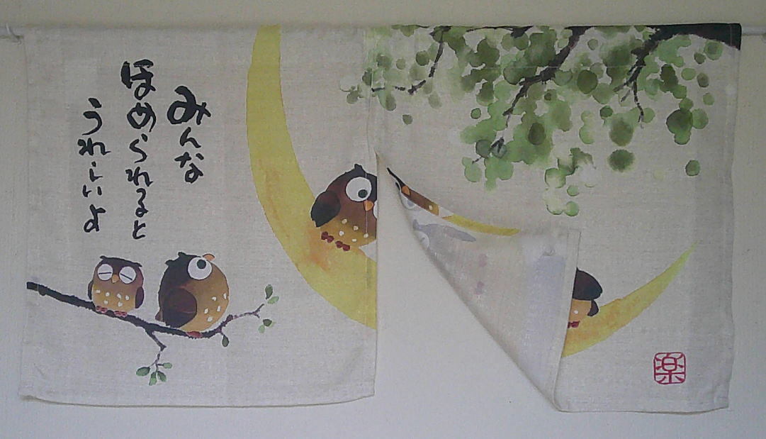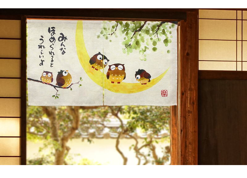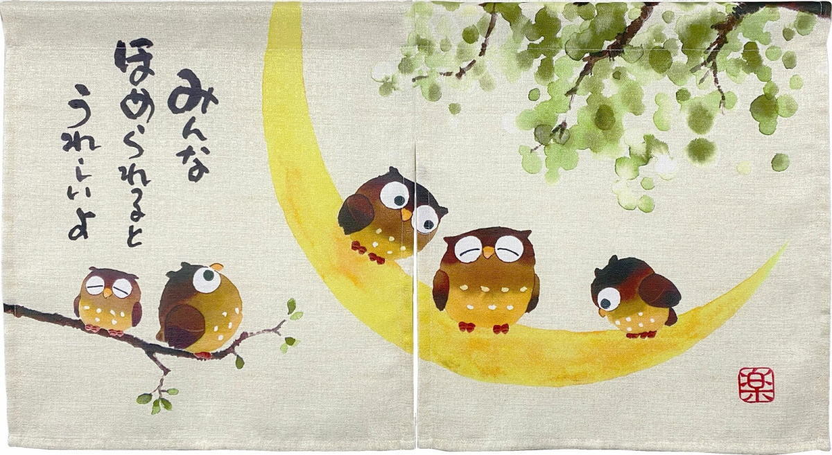 ・三日月と筆書き風ふくろうのデザインをプリントしたメッセージ付きのれんです。