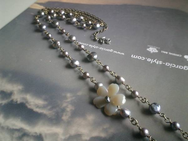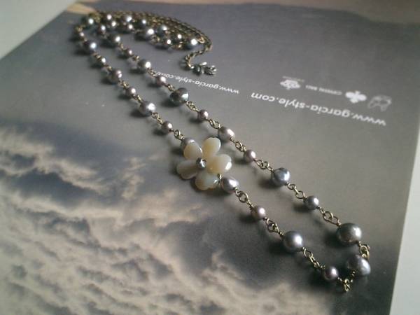 仏蘭西映画の余韻・・シリーズです♪♪淡水パールとお花・・シックな淡水パールのネックレスです♪グレーカルセドニーのお花を合わせて可憐な表情です♪淡水パールは7ミリから9ミリ位までのボタン、バロックなど大きさ違い、デザイン違いです♪♪カルセドニーのお花は22ミリ位です♪♪長さは全長92センチ位で調節自由です♪2連にされても素敵です♪長さ違いのネックレスやブレスレットも出品しています♪シンプルでいつまでも着けられるデザインを考えて作りました!♪♪ハンドメイドをご理解頂いてノークレーム、ノーリターンでお願いします