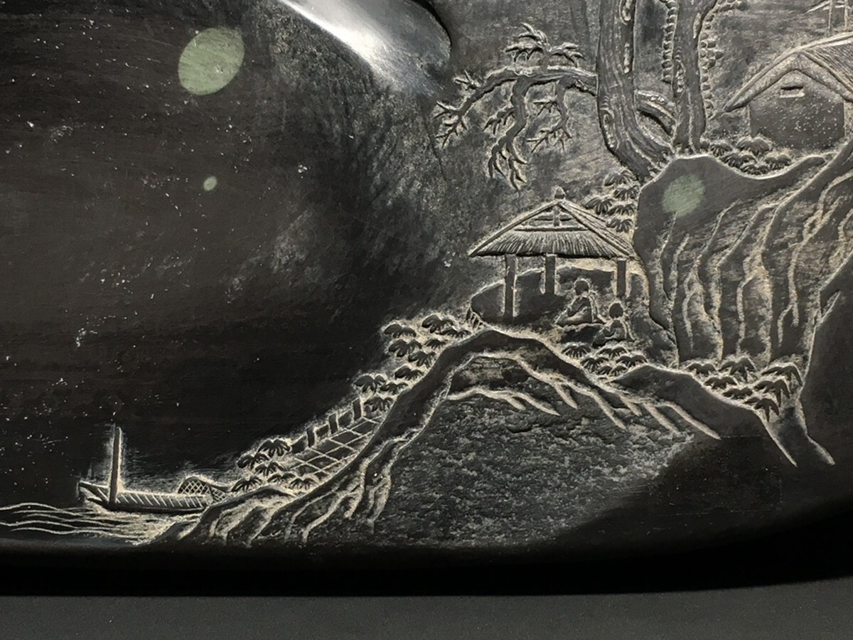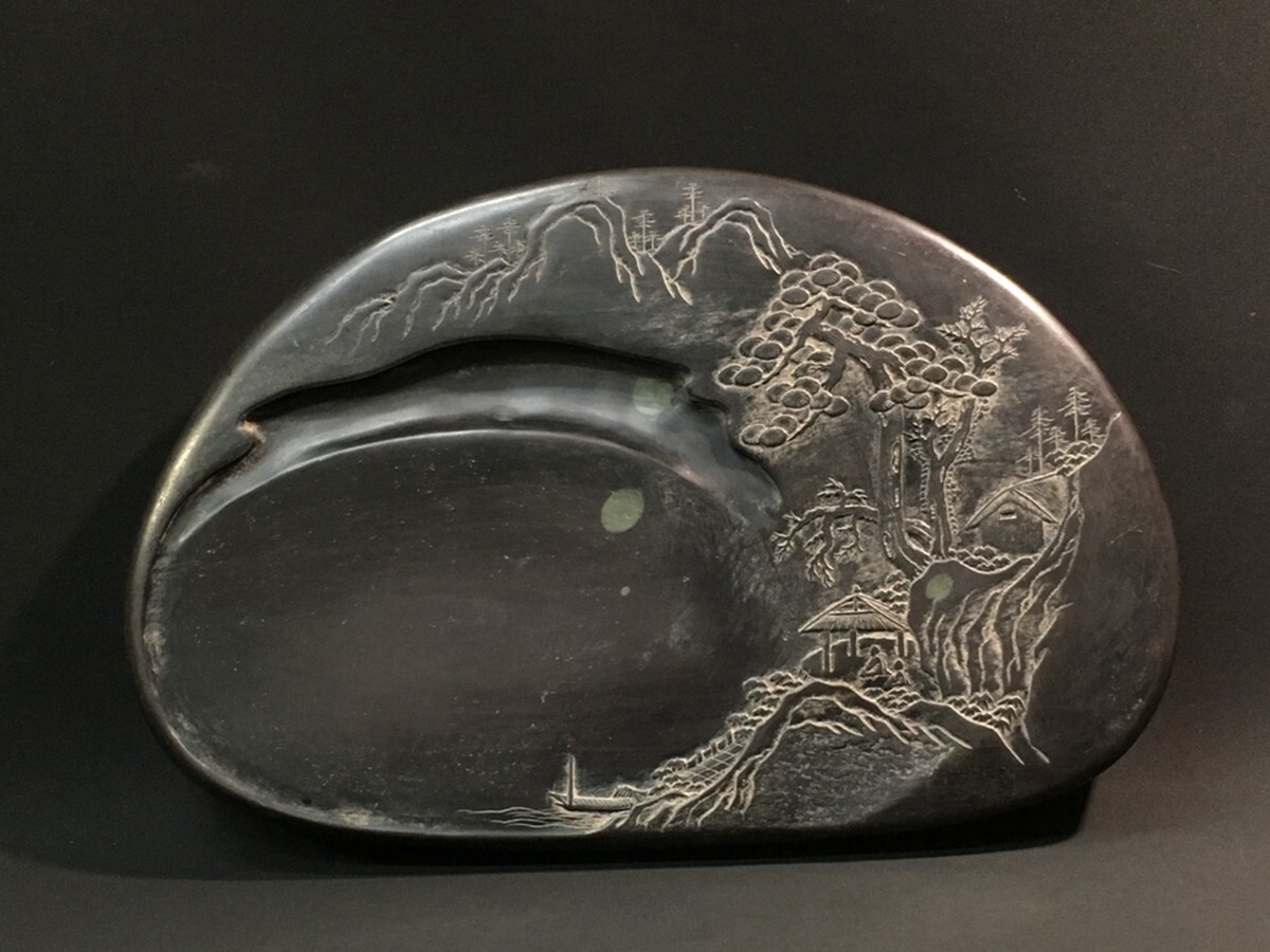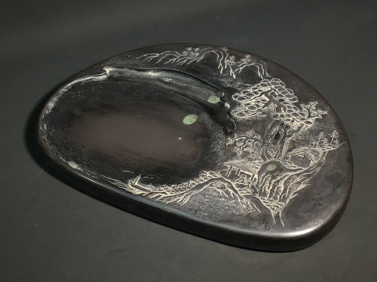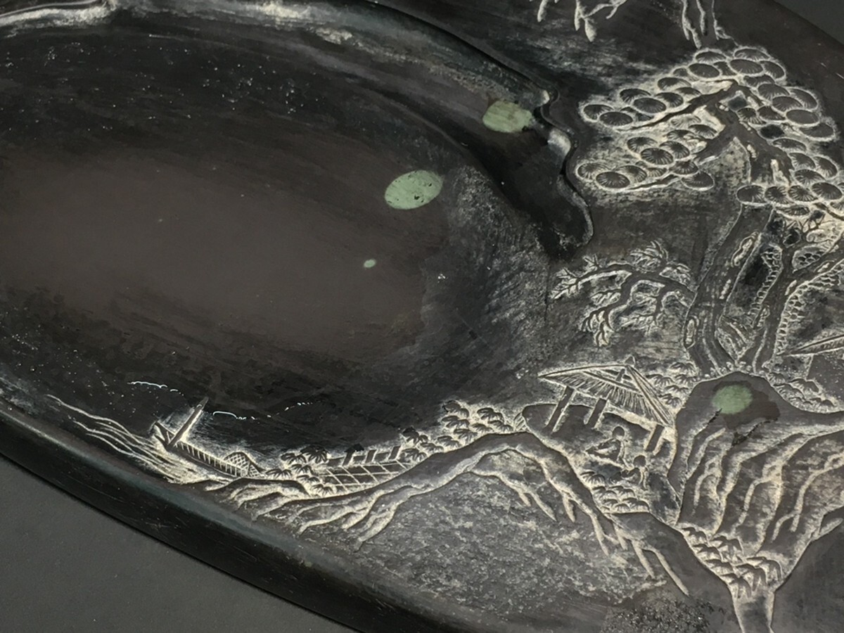 時代物 端石浮彫 湖光山色文房端渓硯 在銘【仁】手彫り 文房具 書道具 中国古硯 蔵出 骨董