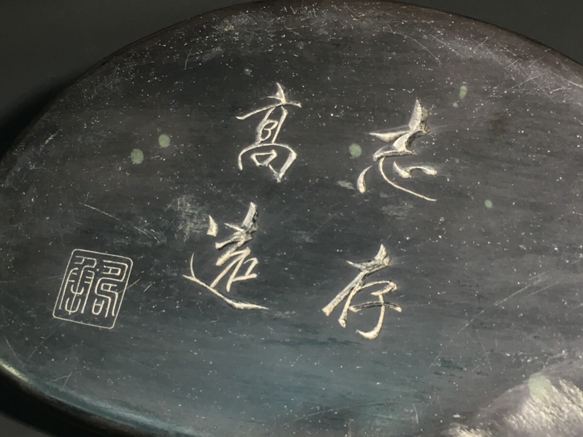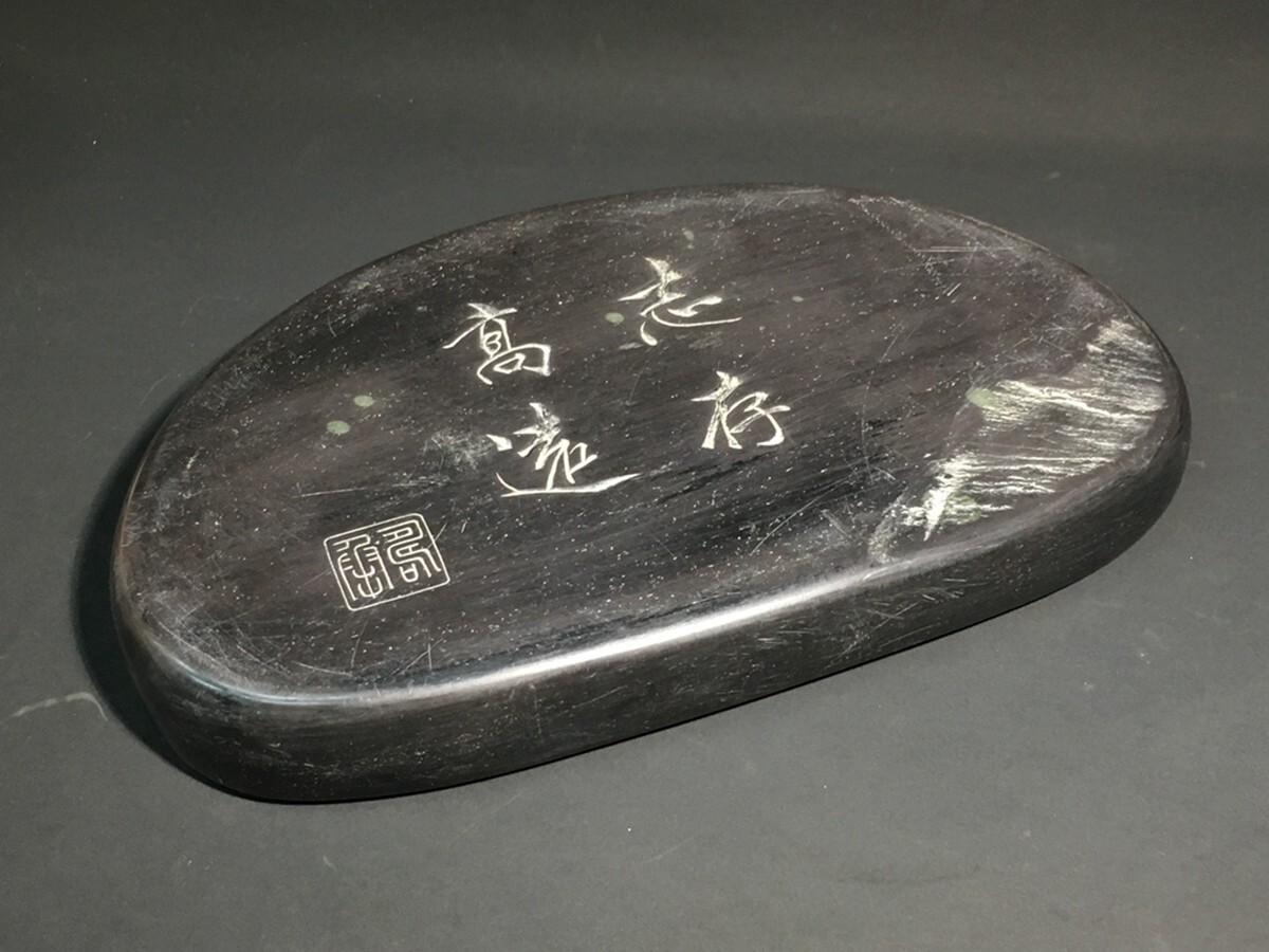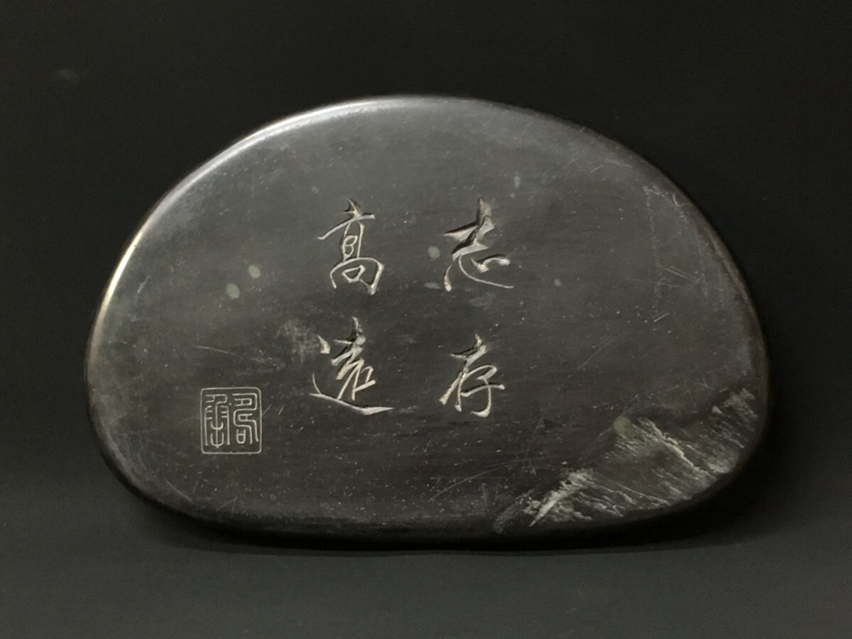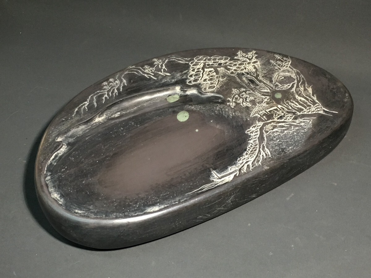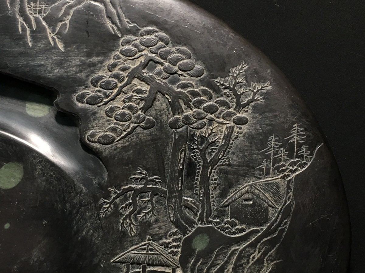 時代物 端石浮彫 湖光山色文房端渓硯 在銘【仁】手彫り 文房具 書道具 中国古硯 蔵出 骨董