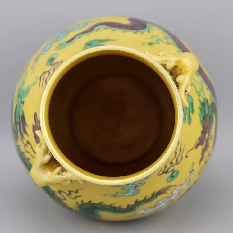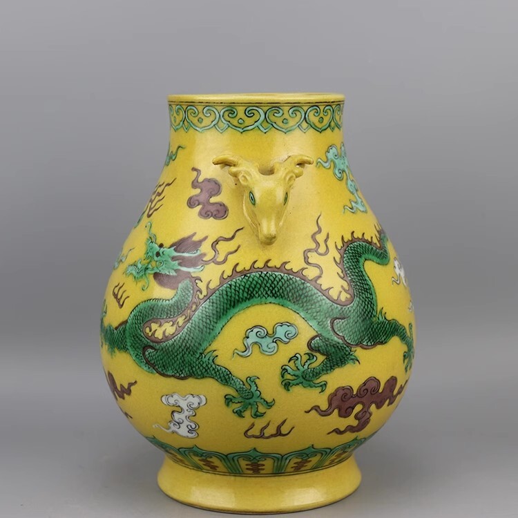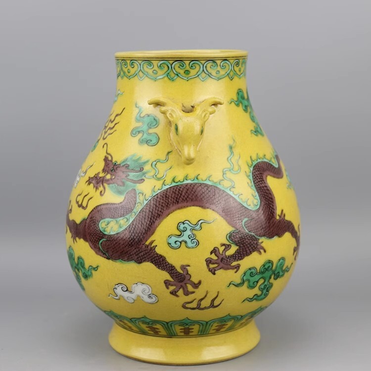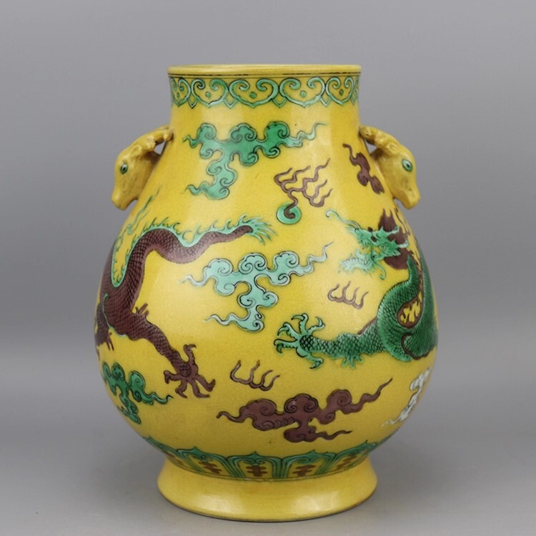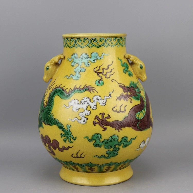大清乾隆年制款 黄地 素三彩雙龍紋 鹿耳尊瓶・古陶磁器 ・珍品旧蔵・古賞物・時代物